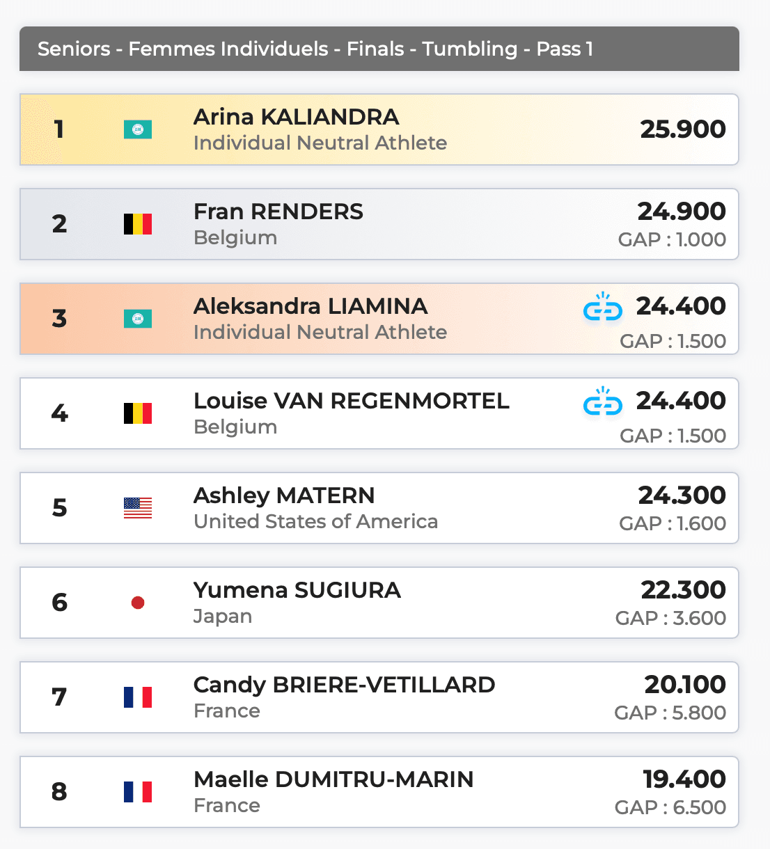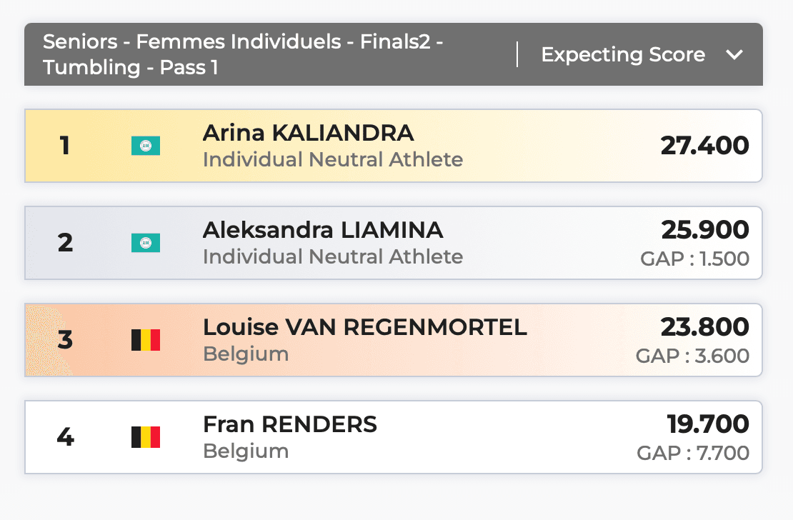 Sur cette première partie de finale (les finales en tumbling se déroulent en 2 temps. Seules les 4 premières participent au second round avec les compteurs qui sont remis à 0, NDLR), Arina Kaliandra (AIN) se classe en tête (25,900), devant la belge Fran Renders (24,900), la russe sous statut neutre Aleksandra Liamina (24,400) et la belge Louise Van Regenmortel (24,400).