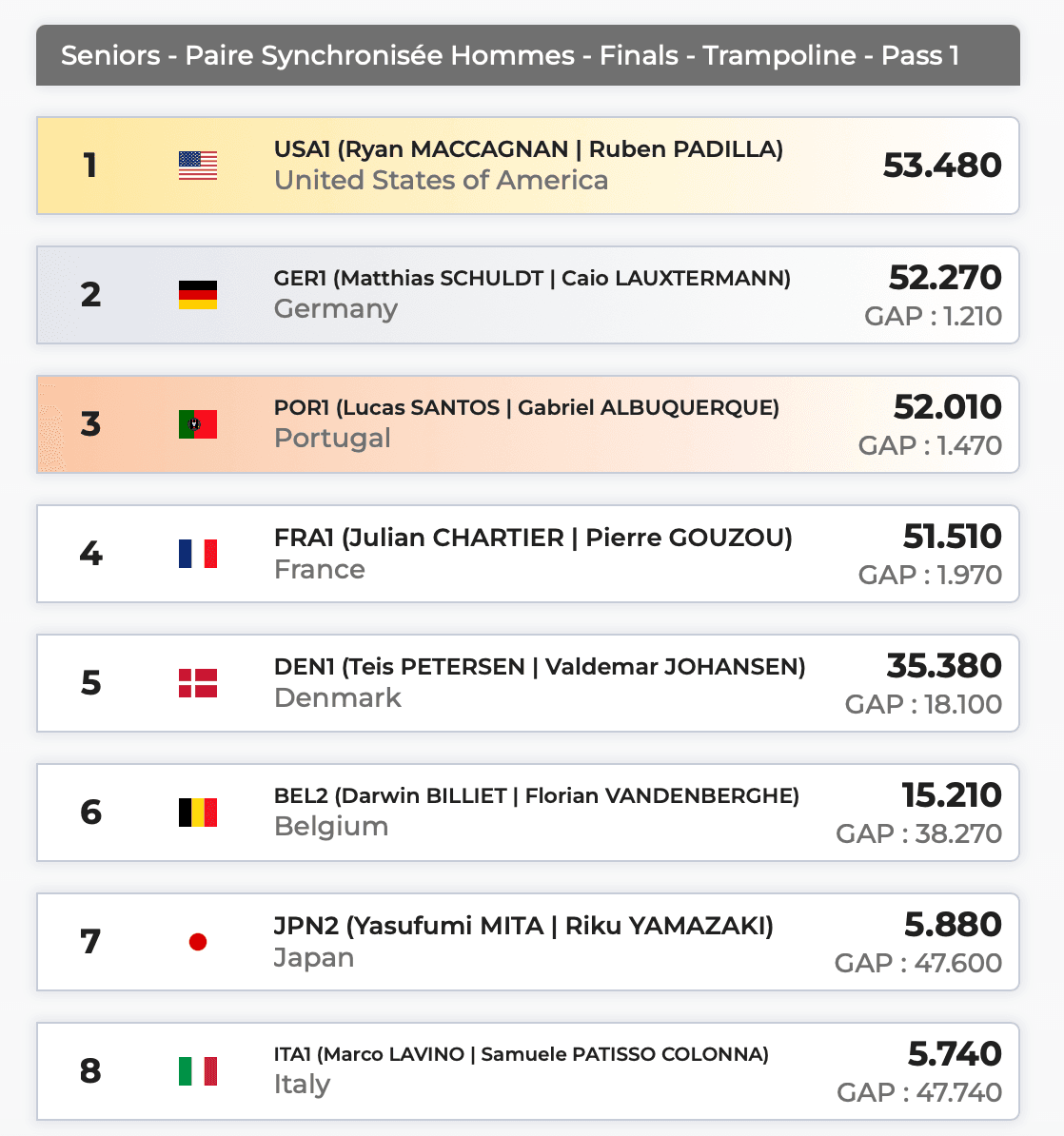À ce moment de la finale, il ne restait plus qu’une paire à passer : celle des Portugais. Ils commettent également des erreurs mais ne chutent pas. Avec la note de 52,010, à 5 dixièmes de points, ils passent devant les Français et s’emparent du bronze, reléguant les Bleus à la 4ème place. L’argent revient aux Allemands (52,270) et l’or aux Américains, intouchables ce samedi à Antibes (53,480).