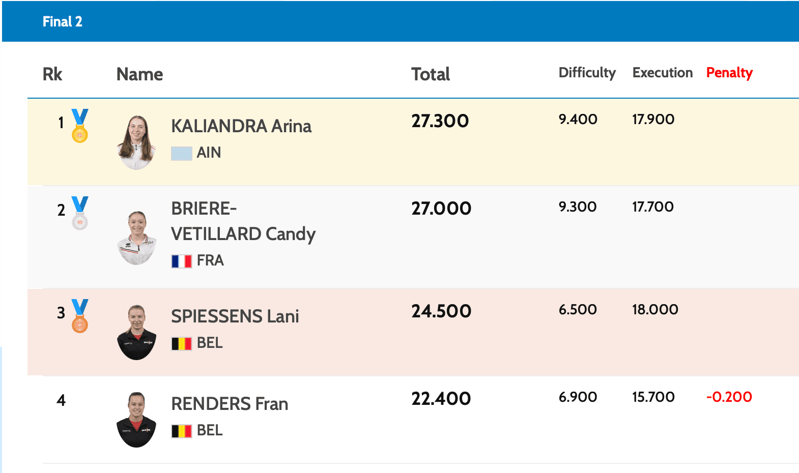 Première à s’élancer, la belge Fran Renders chute en réception, perdant rapidement tout espoir de médaille. Deuxième finaliste belge, Lani Spiessens, 17 ans, poursuit et réalise un bon passage. Troisième à s’élancer, Candy Brière-Vetillard réalise un très bon passage. Avec la note de 27.000 points, elle prenait la première place provisoire du classement. Mais Arina Kaliandra présente à son tour un excellent passage et s’offre l’or avec la note de 27.300 points.