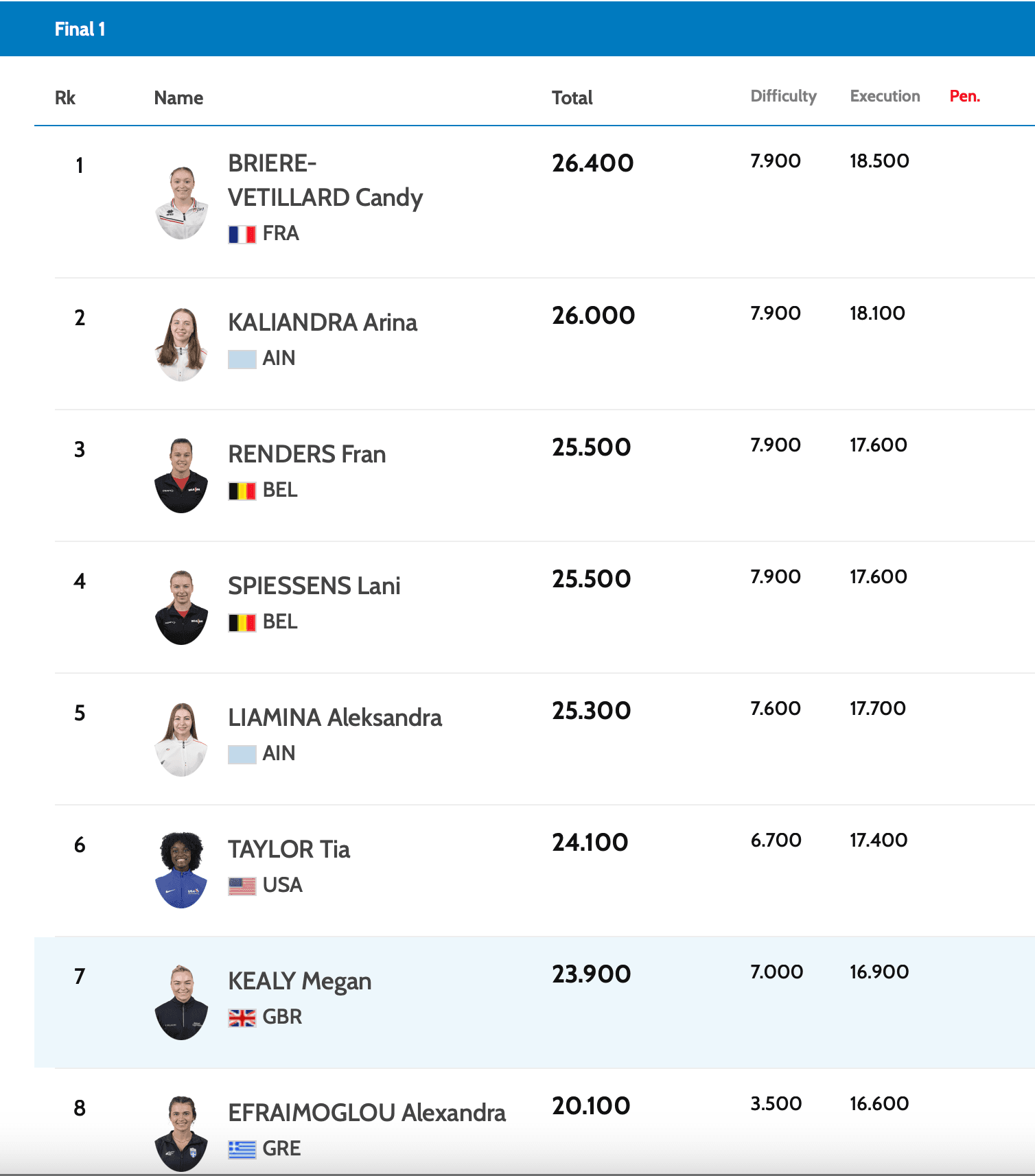 Première des demi-finales avec la très belle note de 27.100 points, la Mancelle, championne du monde en titre, faisait figure de favorite en finale. Sur le premier tour des finales, Candy Brière-Vetillard confirme en réalisant un excellent passage ce qui lui a permis de se classer à la première place du classement avec la note de 26.400 points. Moins de réussite en revanche pour la britannique Megan Kealy, médaillée d’or aux Jeux Mondiaux cet été, qui a terminé à la 7ème place. De son côté, la grecque Alexandra Efraimoglu, championne d’Europe en titre, a glissé à la 8ème place du classement après une chute à la réception.