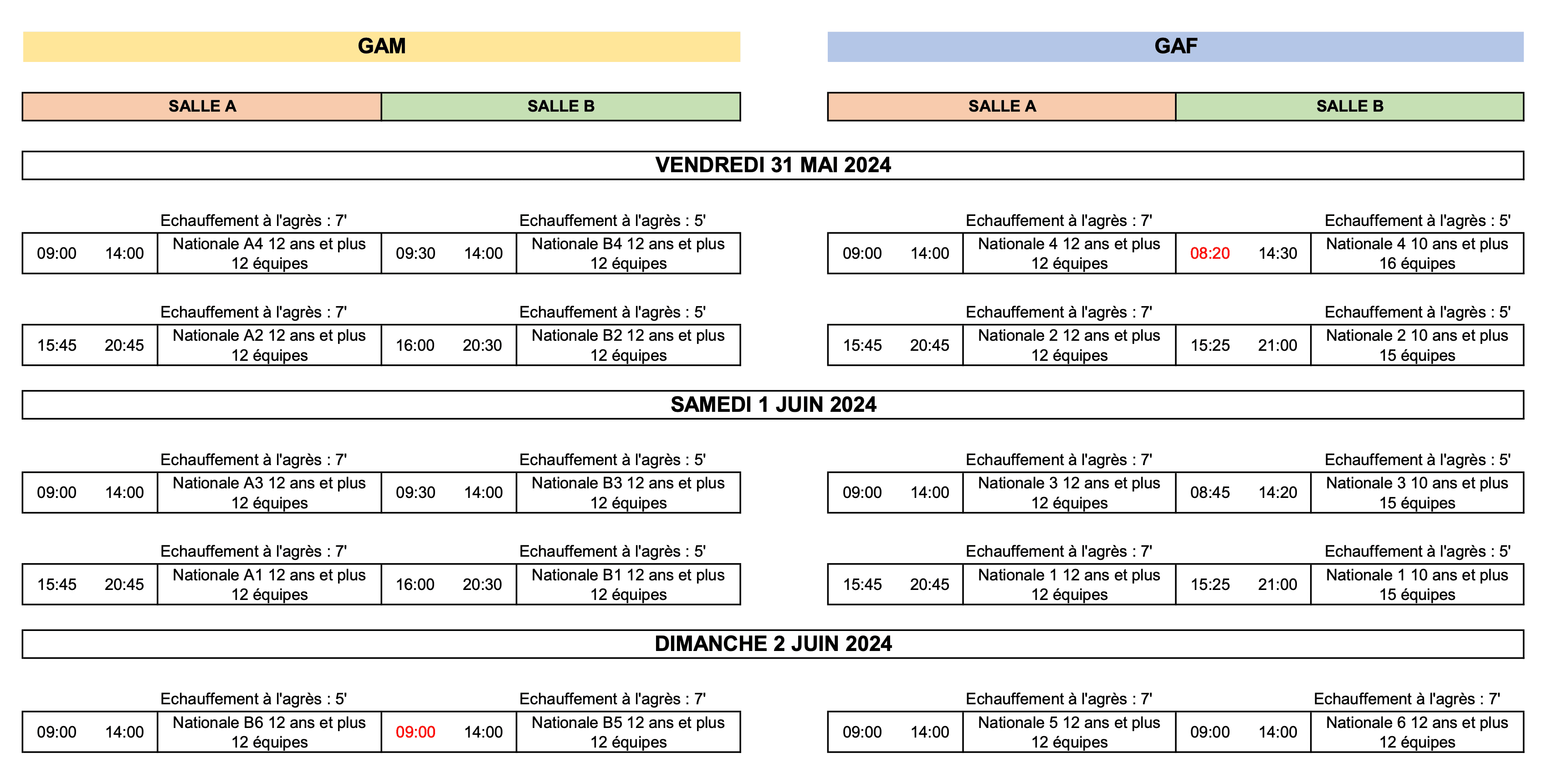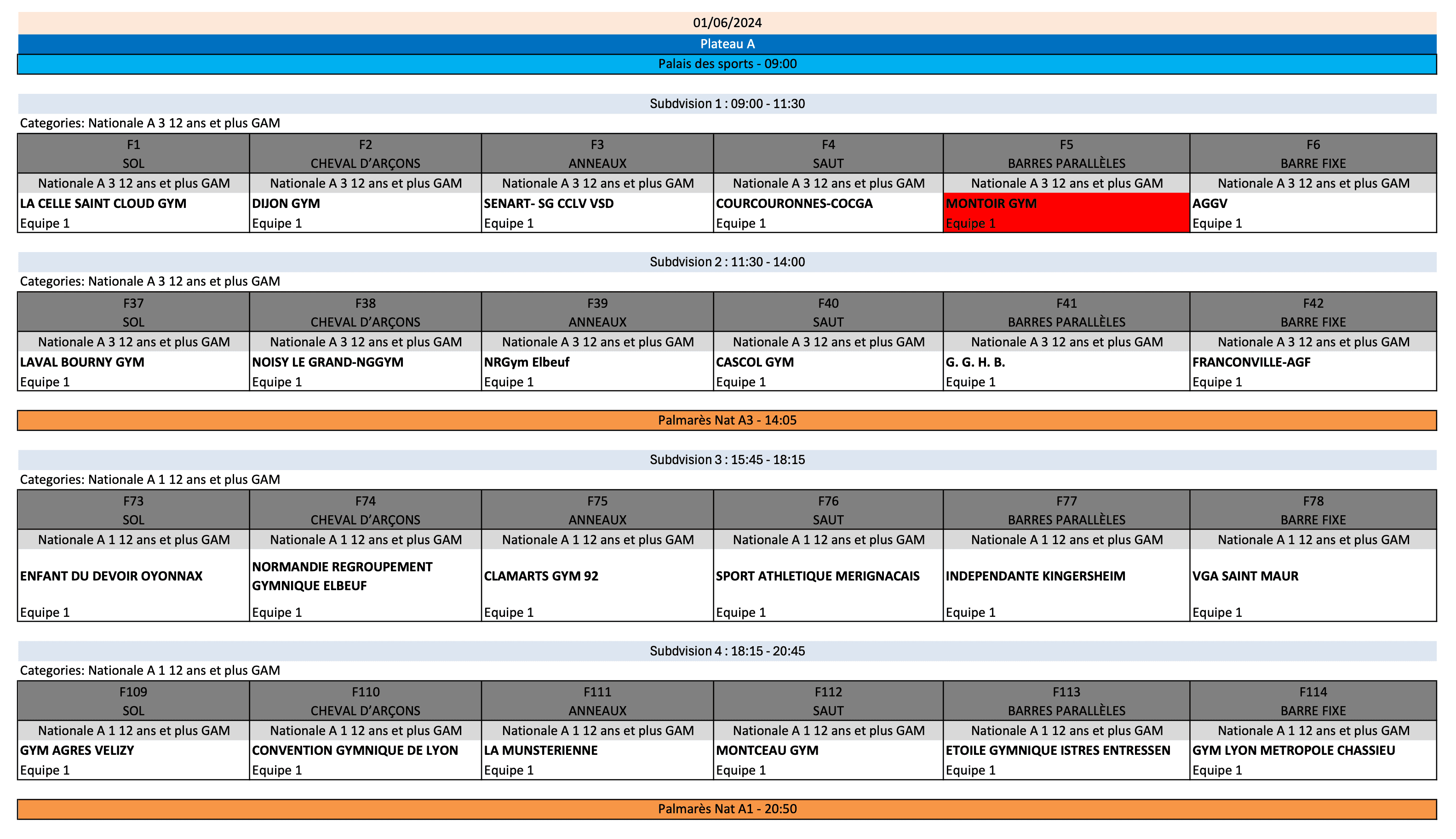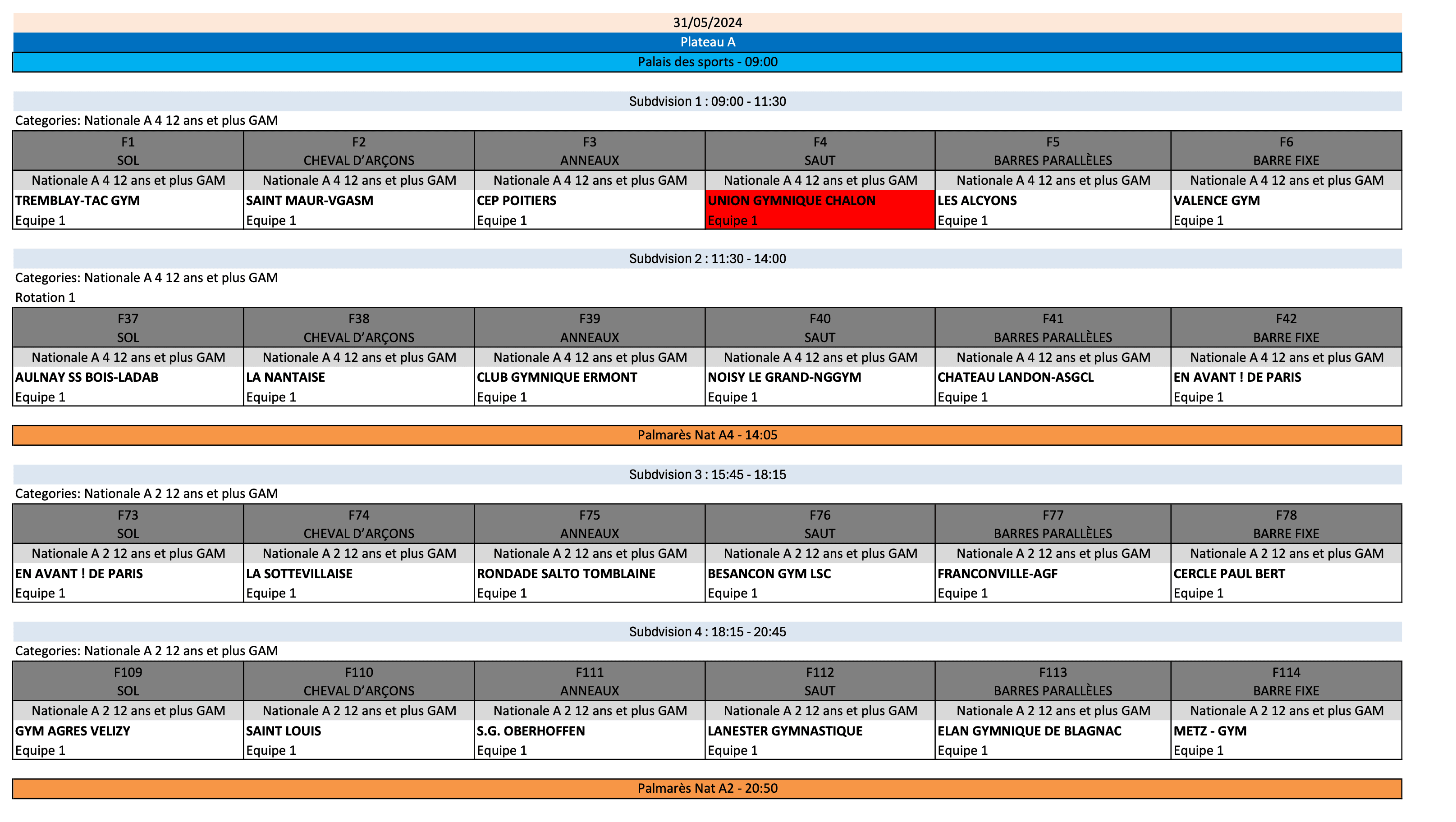 Mulhouse accueille les championnats de France par équipe en Nationale A et B. La catégorie phare, la Nationale A1 12 ans et +, se tiendra en GAM et en GAF le samedi 1er juin de 15h45 et 20h50. Relégués du Top 12 en Nationale A1 pour raisons administratives en début de saison, les clubs GAF d’Avoine, Hyères et Schiltigheim évolueront dans la première subdivision.