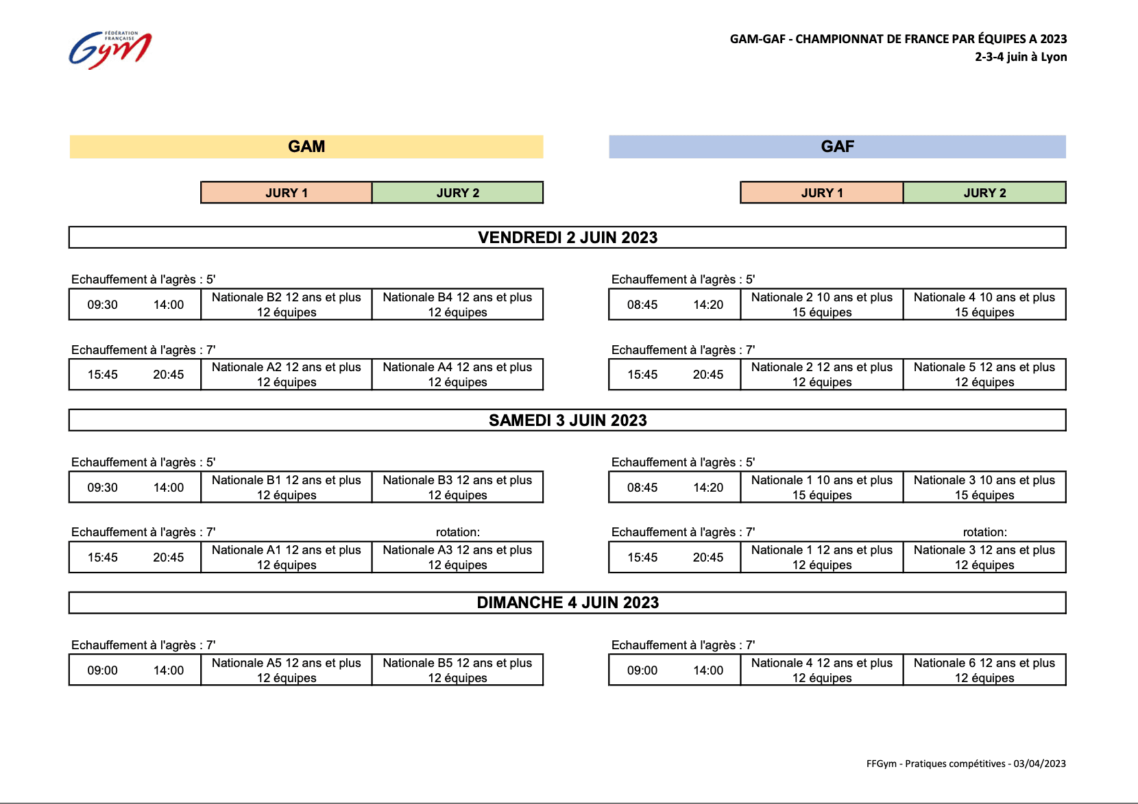 Le Palais des sports de Lyon accueille les championnats de France équipes Nationale A et B en GAM et GAF du 2 au 4 juin. Au terme du week-end, on connaîtra notamment les deux nouvelles équipes GAM et les deux nouvelles équipes GAF qui évolueront en Top 12 la saison prochaine.