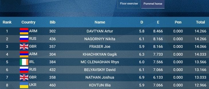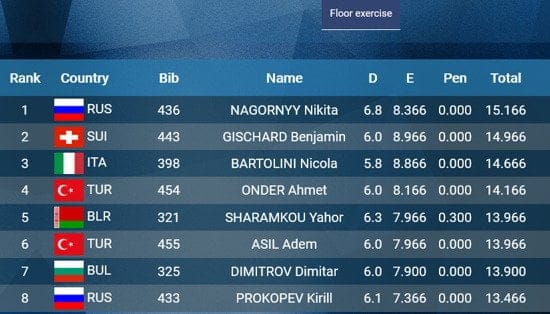 Chez les masculins, c’est le russe Nikita Nagornyy qui s’est imposé. L’argent revient à son compatriote David Belyaskiy et le bronze à l’ukrainien Illia Kovtun, âgé tout juste de 17 ans.