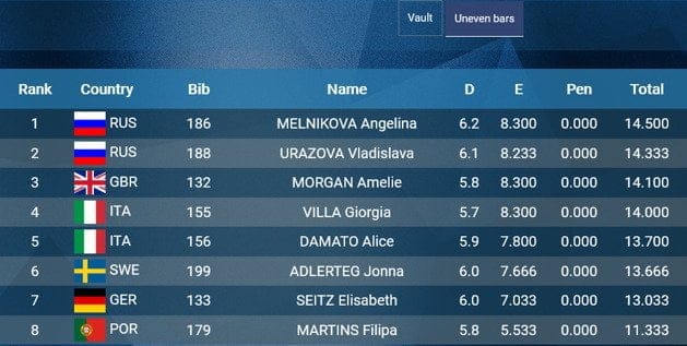| 3 | 188 | URAZOVA Vladislava | 14.433 | 14.500 | 13.033 | 13.333 | 55.299 | |||