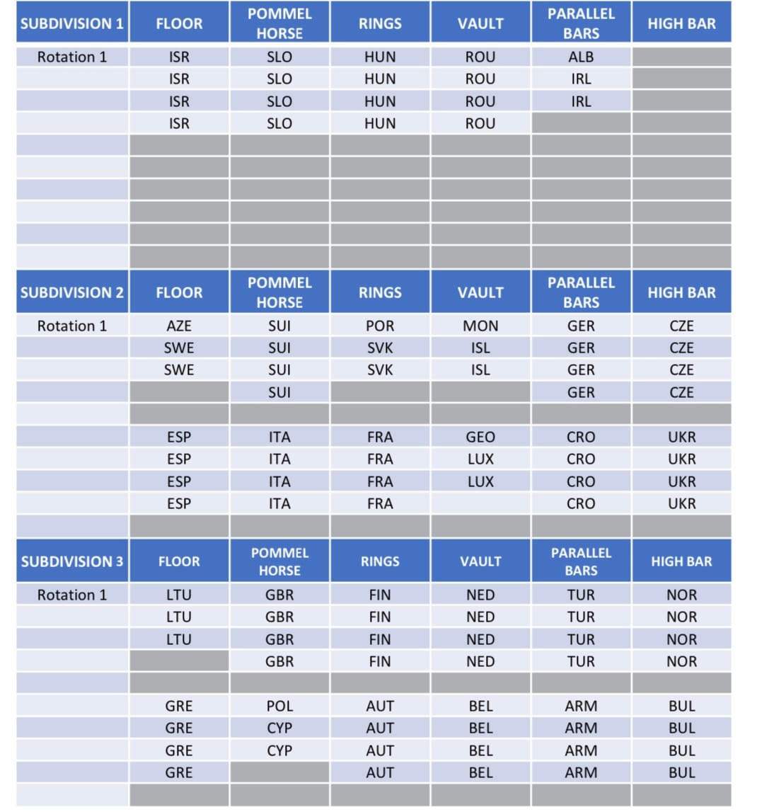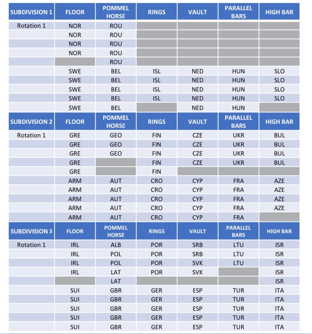 La France évoluera dans la deuxième subdivision et débutera sa compétition aux barres parallèles.