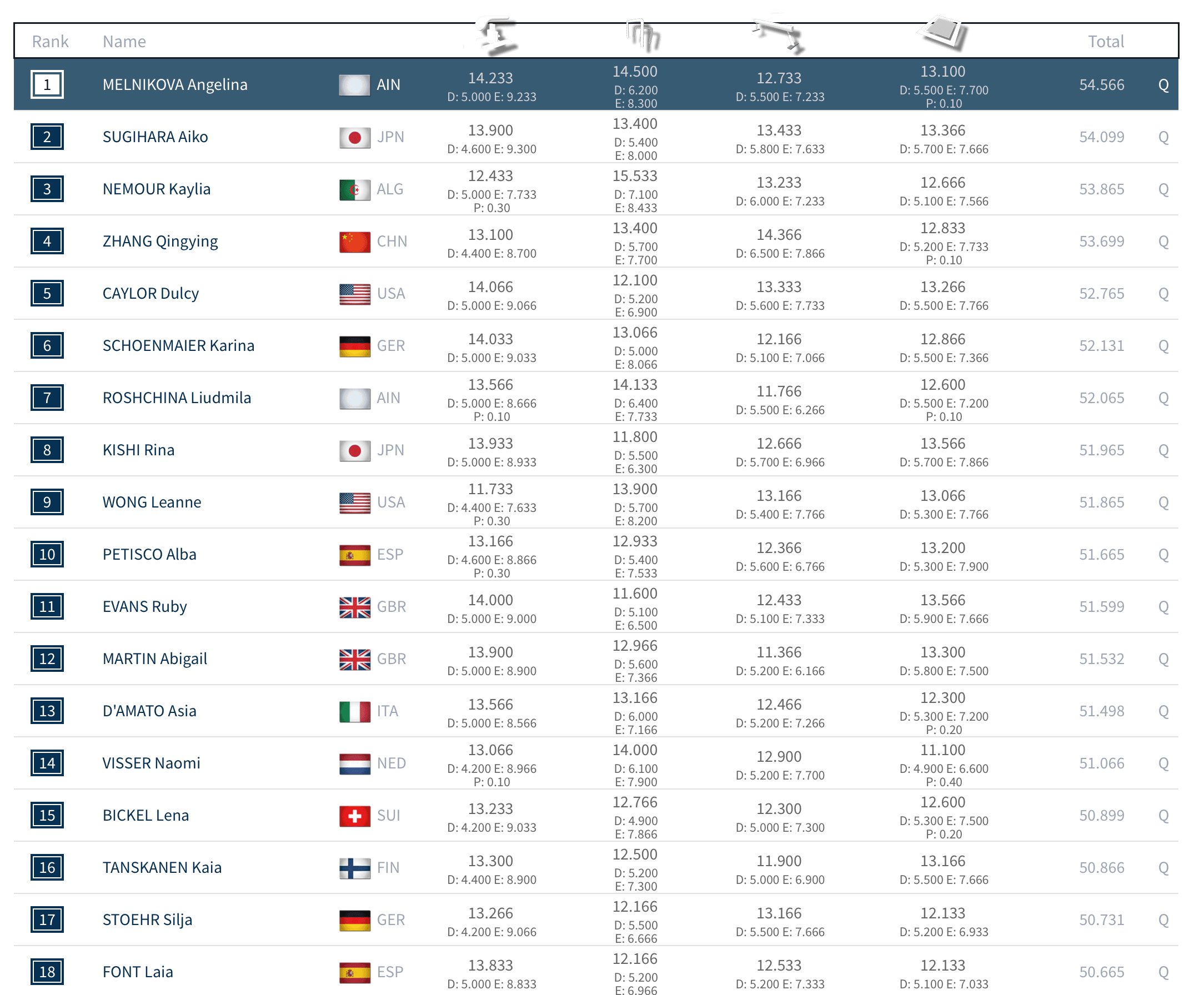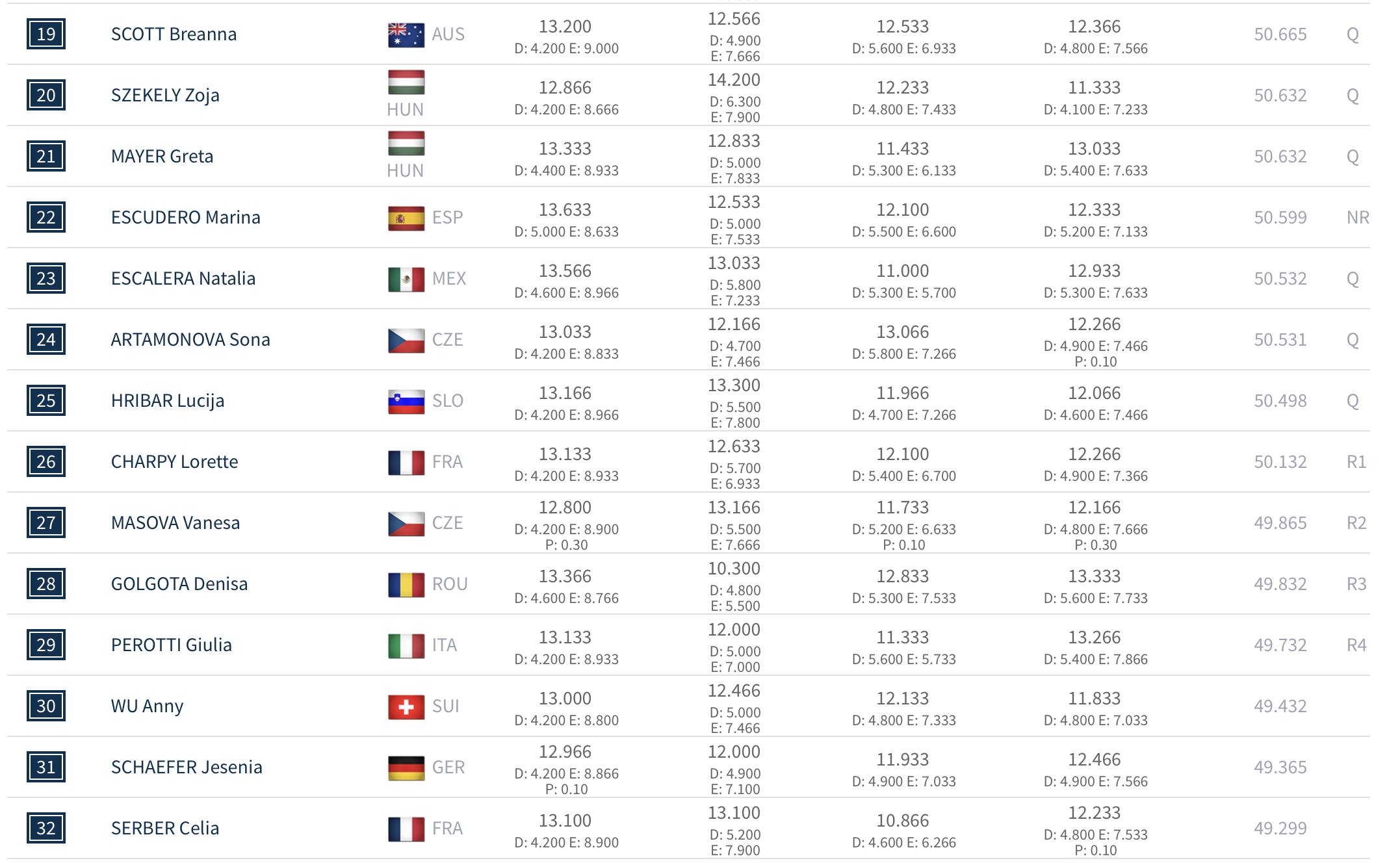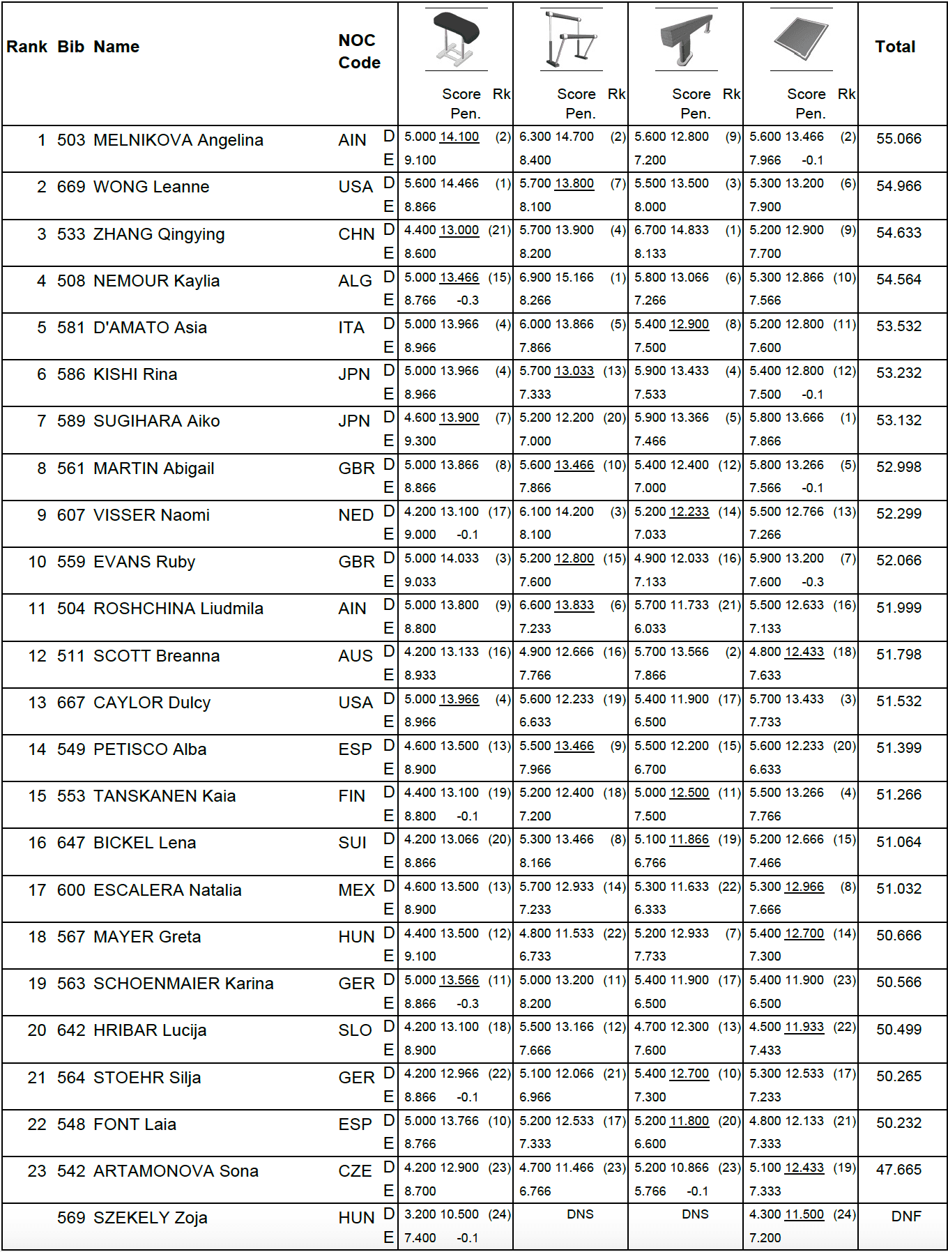 Les résultats des qualifications et des finales des championnats du monde de gymnastique artistique féminine de Jakarta, en Indonésie.