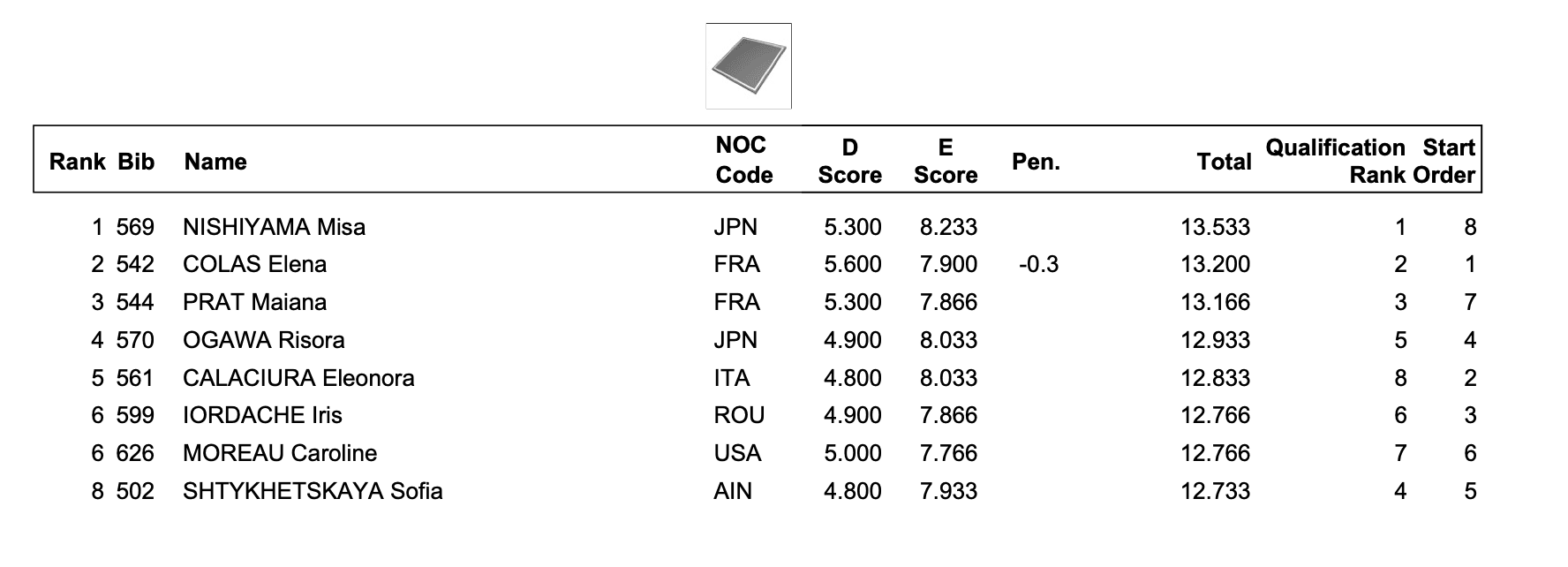 Maïana Prat était la 7ème à passer dans cette finale. Toujours aussi solaire et lumineuse avec une prestance artistique qui la caractérise tant, la gymnaste de Mérignac se positionne à la deuxième place (13.166), juste derrière Elena Colas, à l’issue de son passage. À ce moment de la finale, il restait encore une gymnaste à passer : la japonaise Misa Nishiyama, qui avait terminé en tête des qualifications. En finale, elle est tout aussi solide. Au terme d’un mouvement maîtrisé, elle se hisse directement à la première place du classement, s’offrant l’or mondial avec la note de 13.533. La couleur de médaille qui lui manquait sur ces championnats du monde junior, elle, qui avait les jours précédents remporté l’argent au saut et le bronze au concours général.