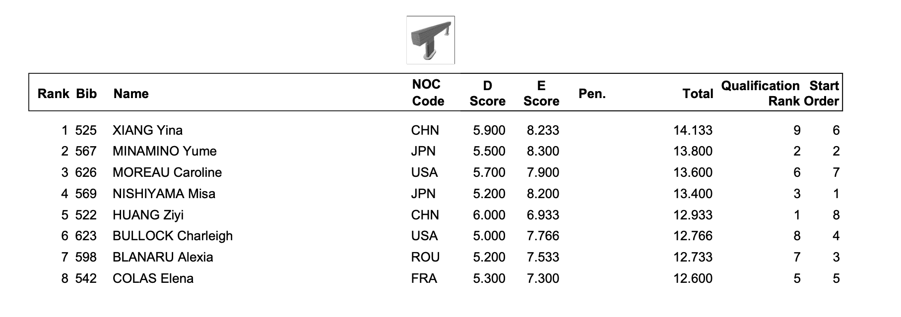 Une finale poutre dominée par la chinoise Yina Xiang, impressionnante de stabilité d’une part et dont le contenu technique lui a permis de passer la barre symbolique des 14. Avec la note de 14.133, elle s’offre l’or. La japonaise Yume Minamino remporte l’argent (13.800) et l’américaine Caroline Moreau le bronze (13.600)