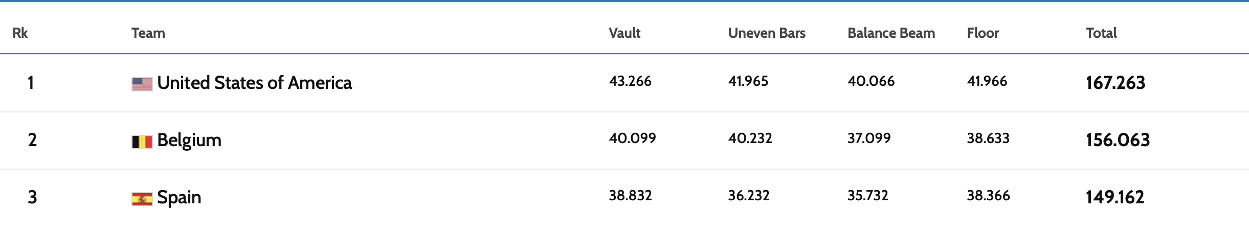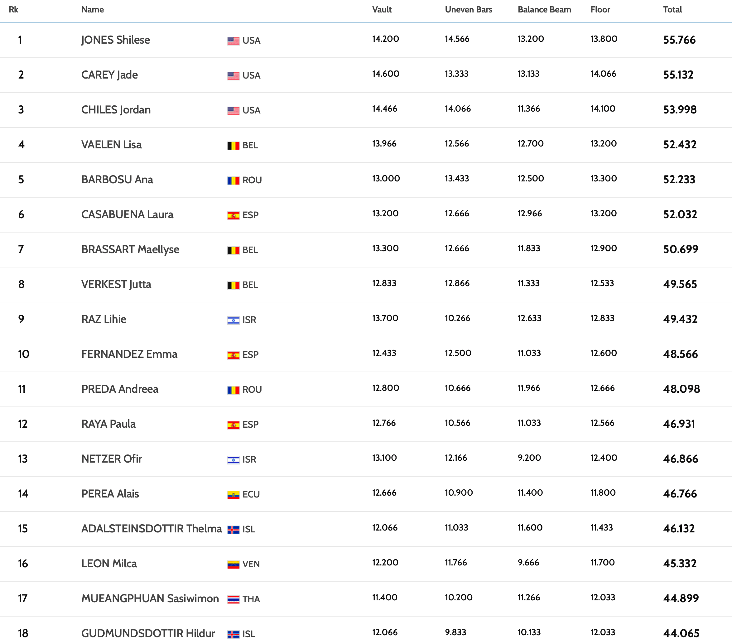 Au concours général, l’américaine Shilese Jones caracole en tête. Elle devance ses compatriotes Jade Carey et Jordan Chiles.
