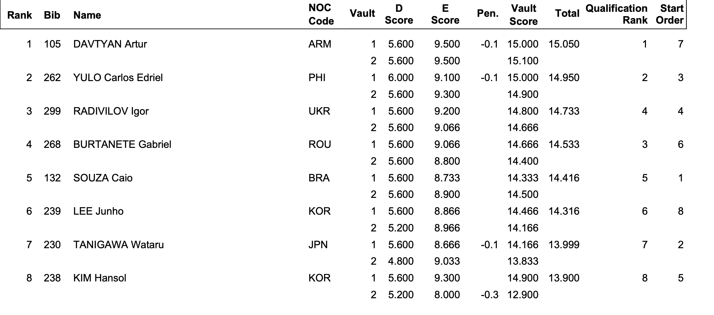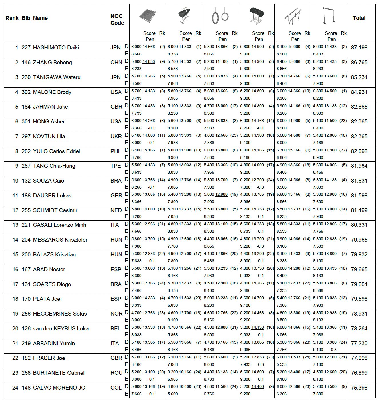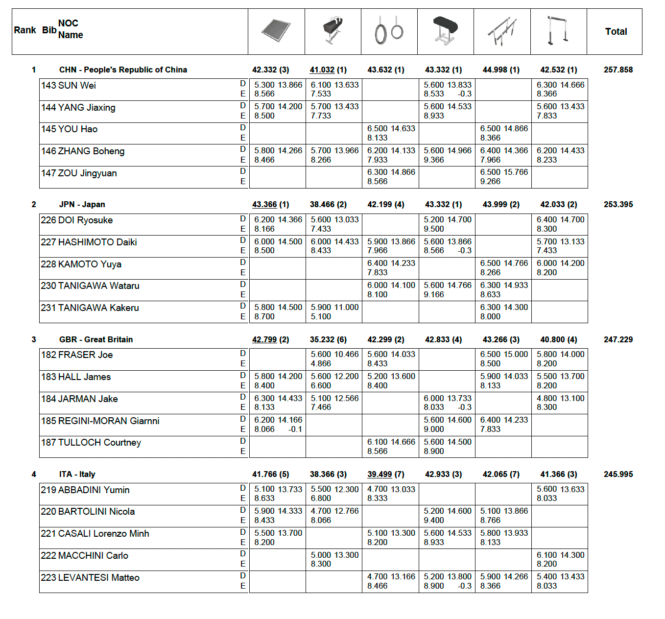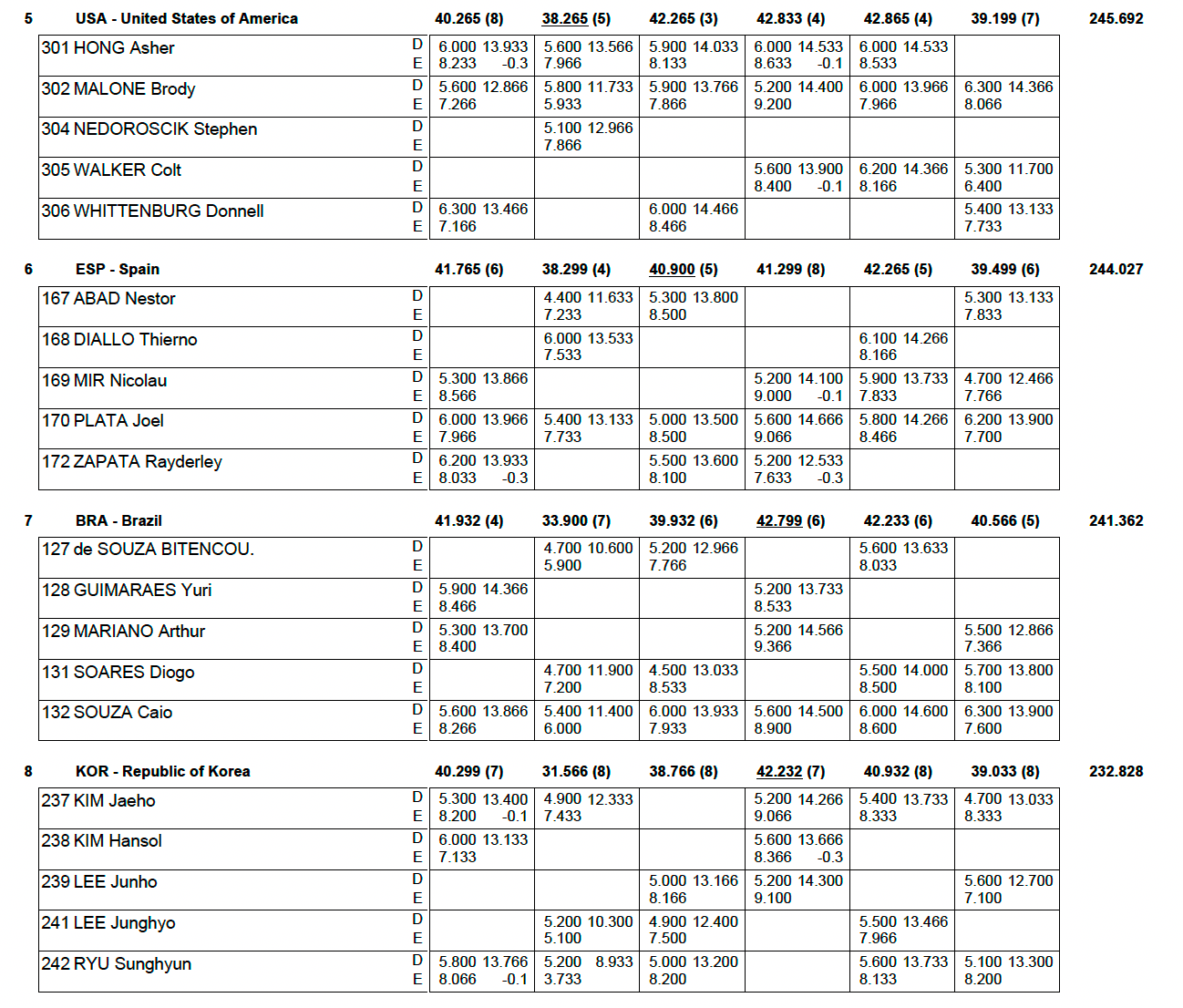 Chez les masculins, Benjamin Osberger termine 4eme de la finale sol. Il était le seul Français aligné en finale en GAM. En équipe, Benjamin Osberger, Léo Saladino, Paul Degouy, Mathias Philippe et Cameron-Lie Bernard ont terminé 14ème des qualifications. Un classement insuffisant pour atteindre la finale équipes.