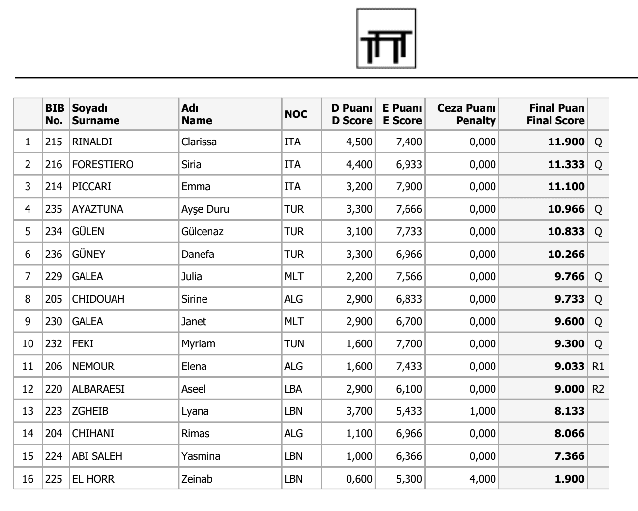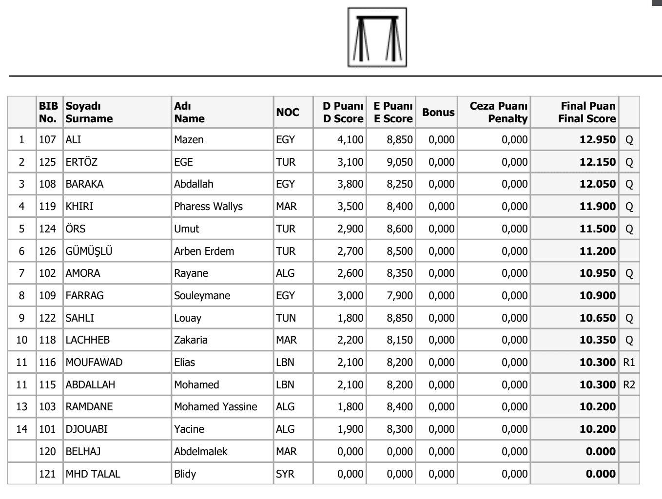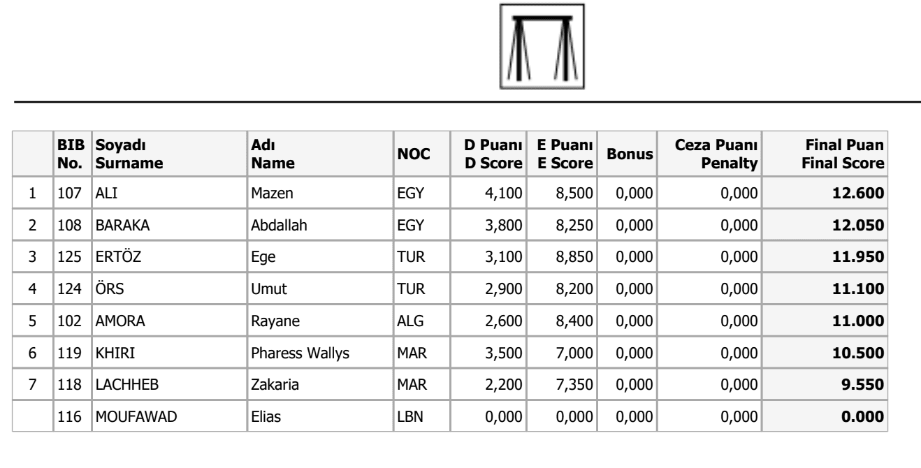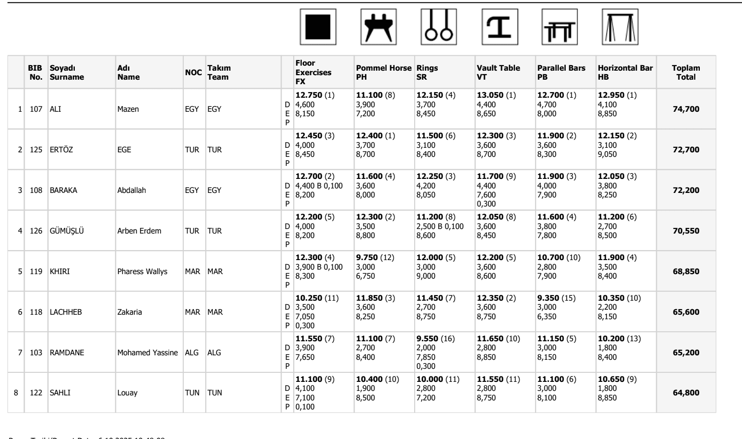 Pour sa toute première compétition internationale, Elina Nemour décroche l’argent à la poutre. Du côté des masculins, Wallis Khiri remporte le bronze aux anneaux et au saut, et Zakaria Lechheb le bronze aux arçons. Ils remportent également une médaille de bronze historique en équipe.