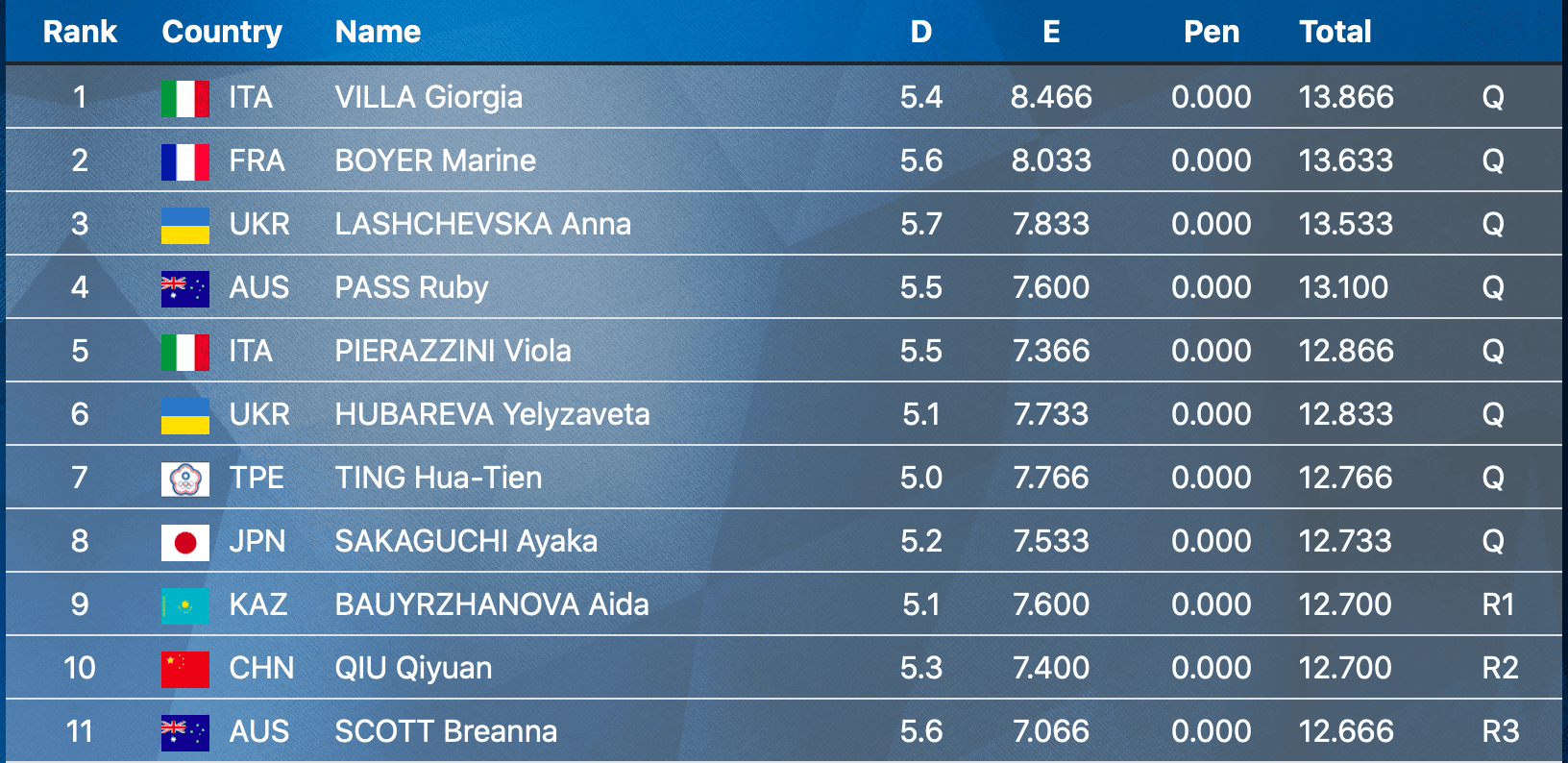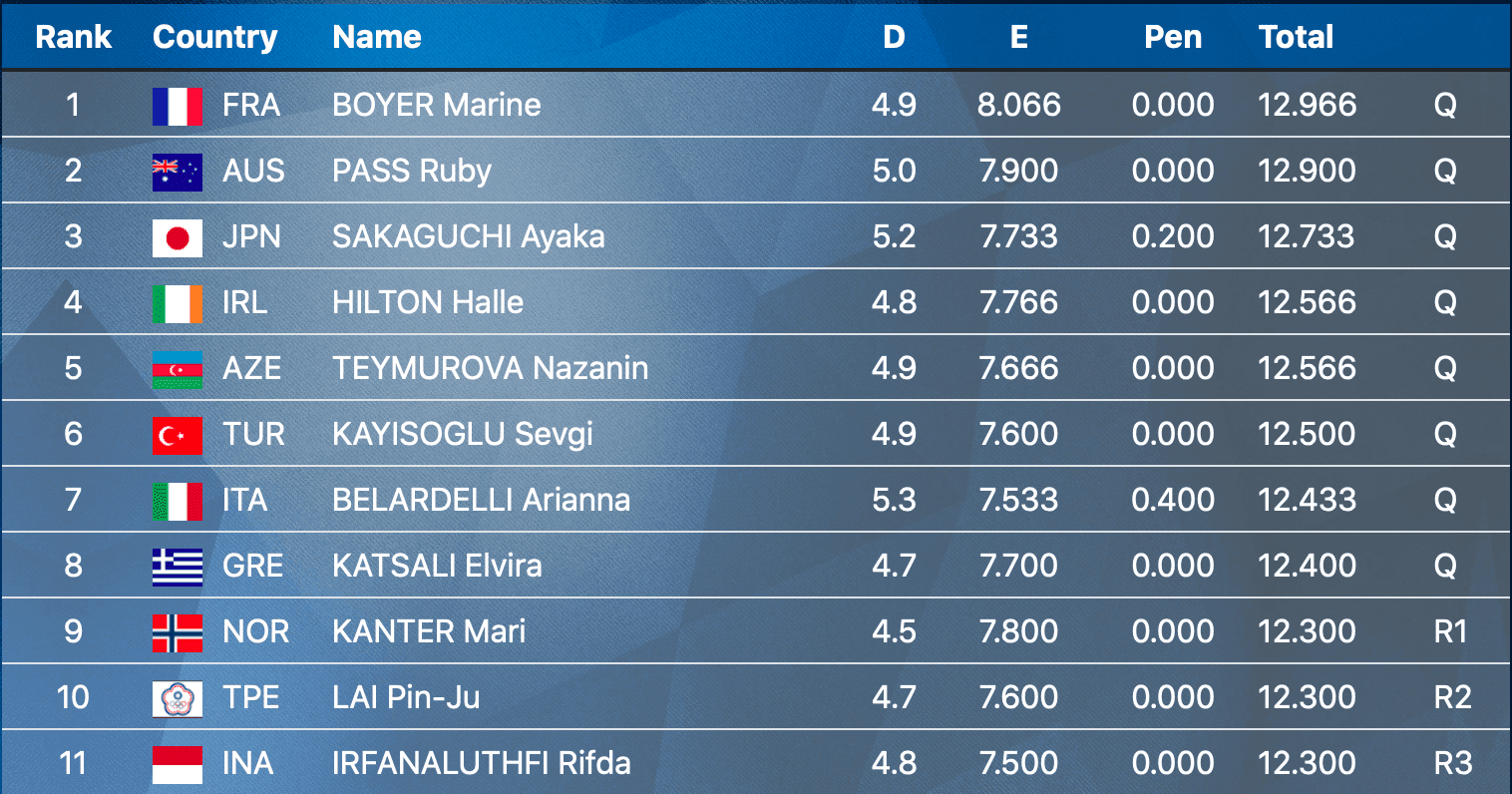 Également alignée au sol, la multiple médaillée internationale se montre tout aussi solide. Avec la note de 12.966 (ND 4,9 / NE 8,066), elle prend la tête des qualifications et décroche une nouvelle place en finale.