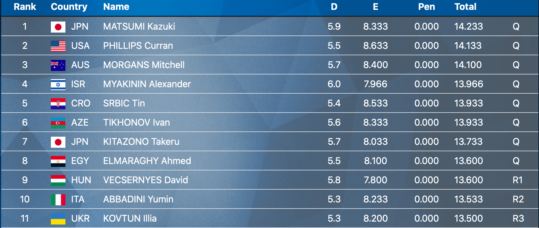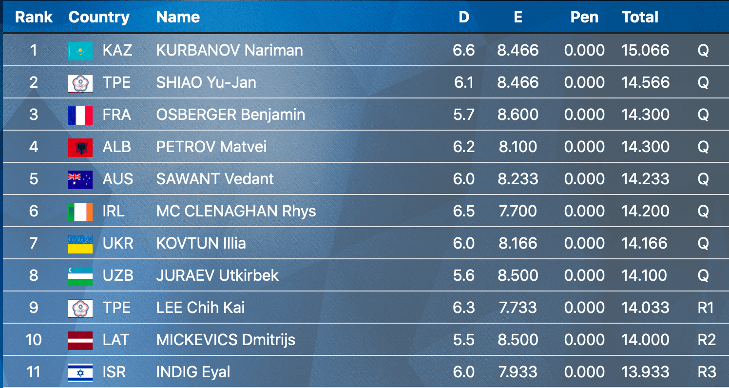 Du côté des masculins, Cameron-Lie Bernard et Benjamin Osberger se sont tous les deux élancés aux arçons sur l’une des dernières rotations de cette nouvelle journée de qualifications. Dernièrement blessé au genou, Benjamin Osberger a été contraint de déclarer forfait pour le sol mais a bel et bien tenu son rang aux arçons, son deuxième agrès fort. Solide sur ses appuis avec une très belle ligne de jambes, il obtient la très belle note de 14.300 (ND 5,7 / NE 8.600) et décroche sa place en finale en terminant troisième des qualifications. Cameron-Lie Bernard, qui s’est qualifié en finale barres parallèles hier, obtient la note de 12,133 et termine 34ème. Des qualifications arçons dominées par le kazakh Nariman Kurbanov qui décroche la très belle note de 15.066 (ND 6,6).