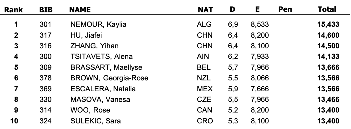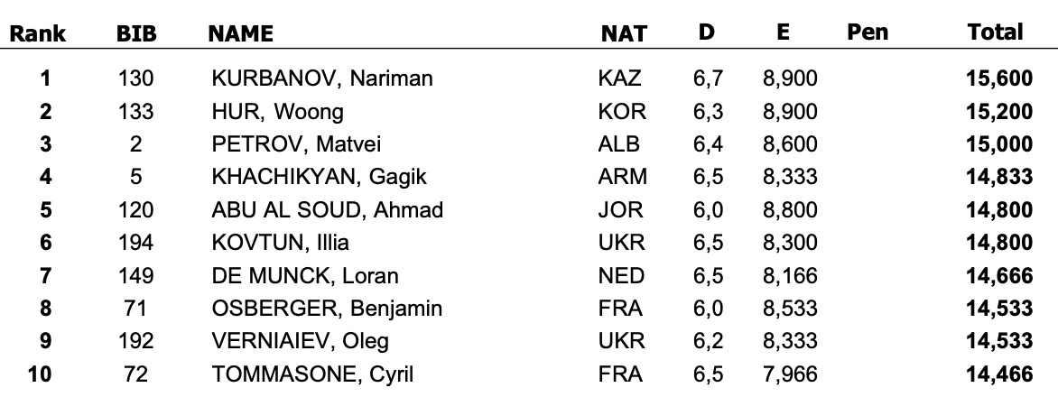 Ce vendredi, suite et fin des qualifications avec Cameron-Lie Bernard aux barres parallèles, Mathias Philippe aux barres parallèles et à la barre fixe, Pierre Stephan (HAI) à la barre fixe et Kaylia Nemour (ALG) à la poutre et au sol. Début des qualifications à 14h.