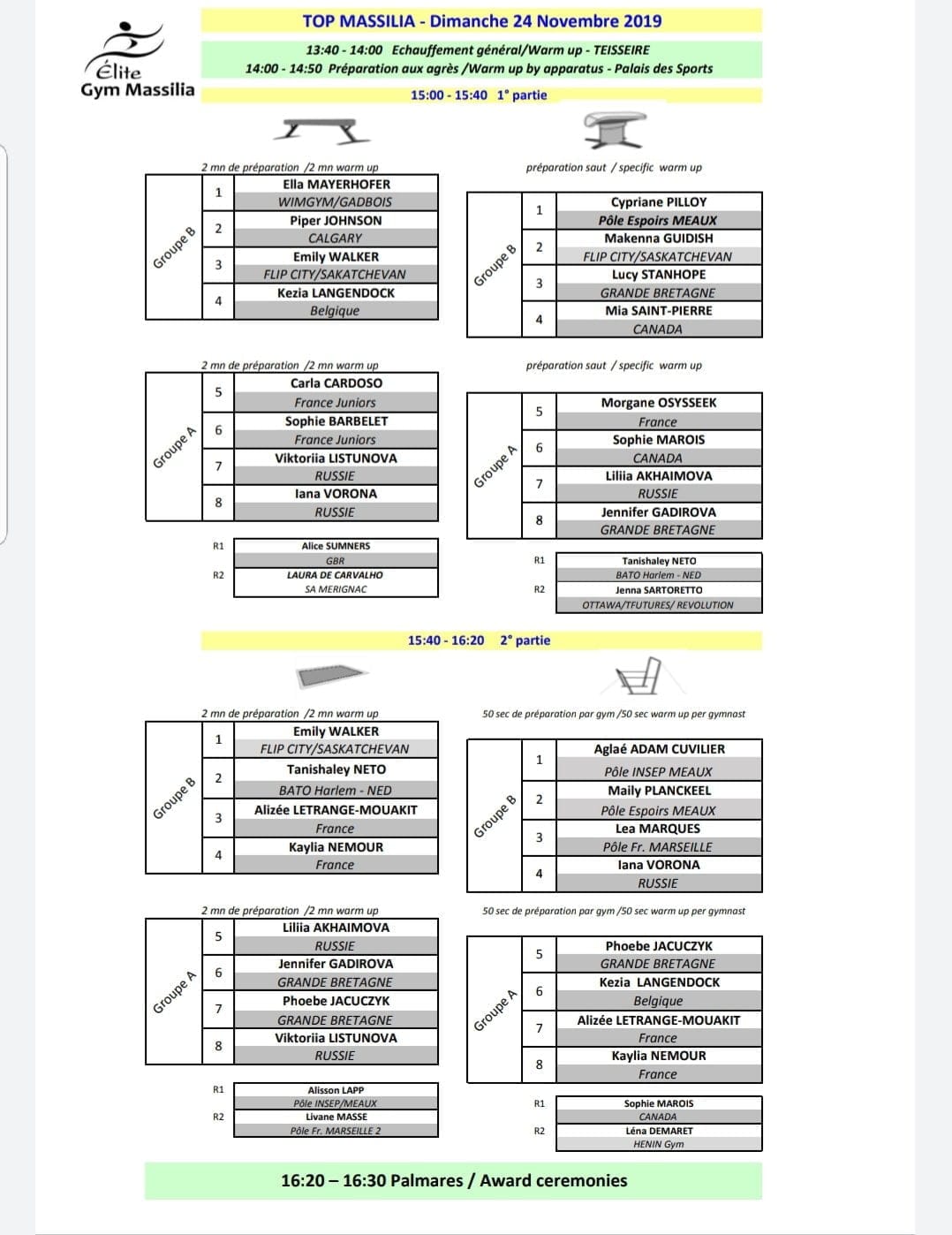L’Elite Gym Massilia se poursuit ce dimanche 24 novembre avec les finales par appareil. De nombreuses Françaises se sont qualifiées à chaque agrès. Début des finales à 15h.