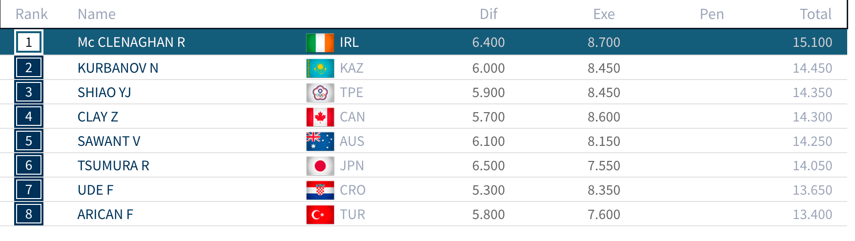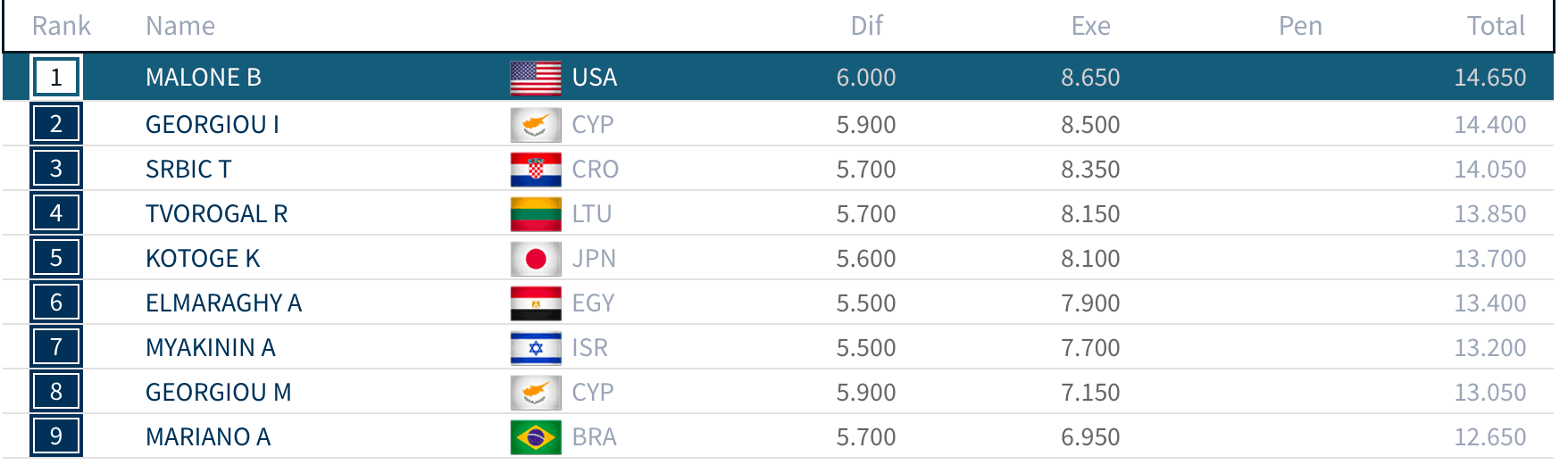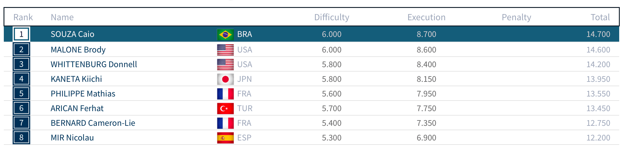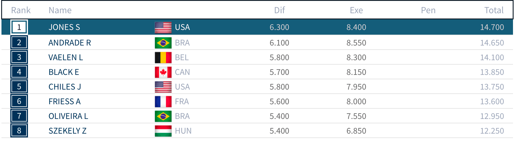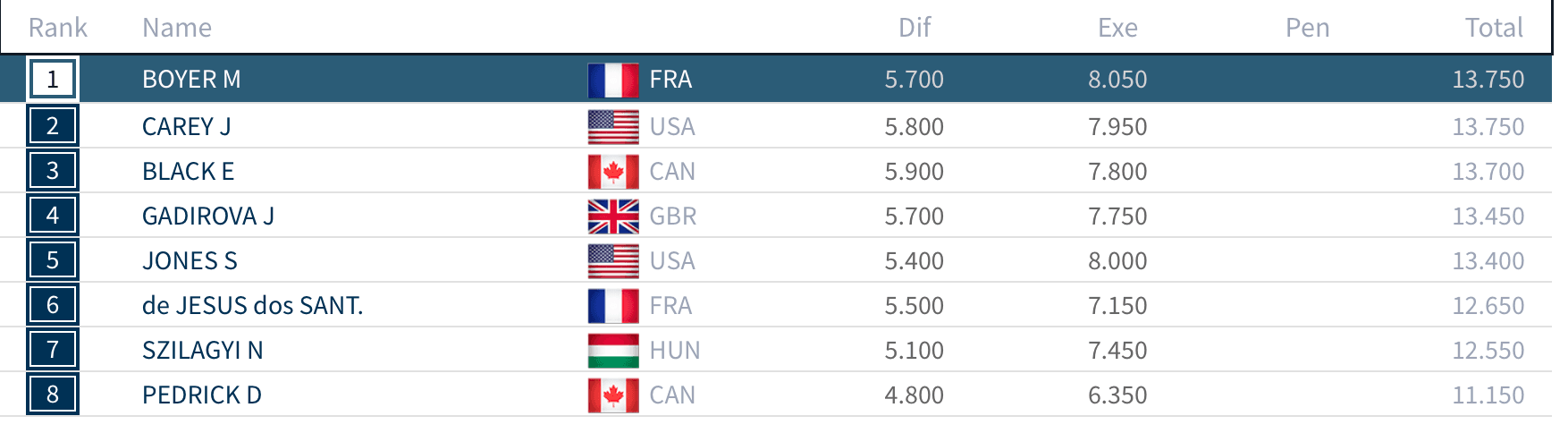 Dans les autres finales, Aline Friess termine 6eme aux barres, Mélanie De Jesus Dos Santos 6eme à la poutre, Mathias Philippe 5eme aux barres parallèles et Cameron-Lie Bernard 7eme aux barres parallèles.