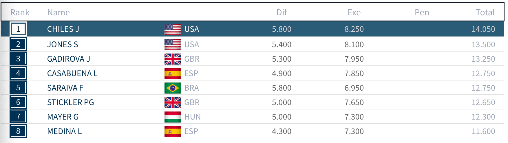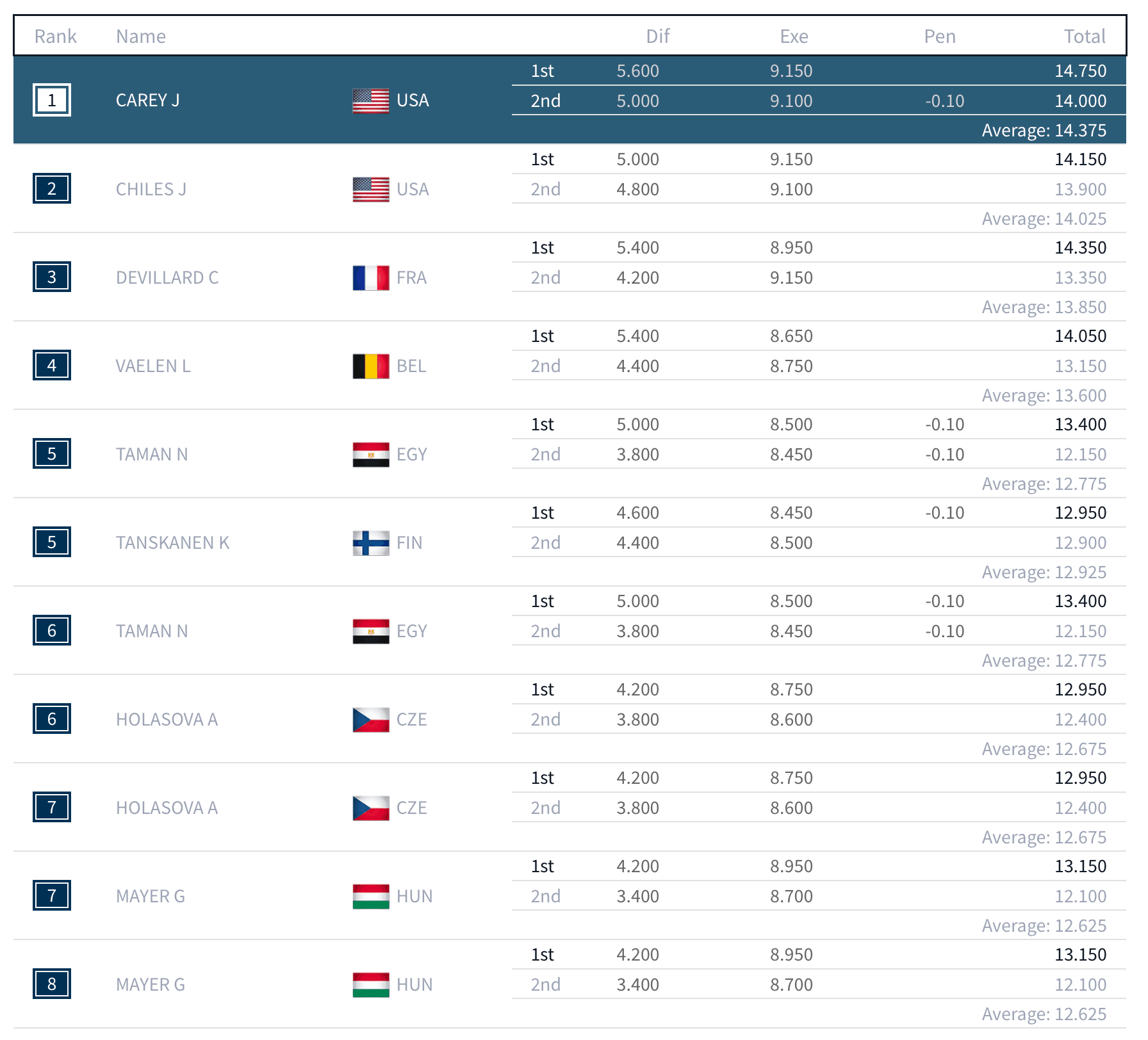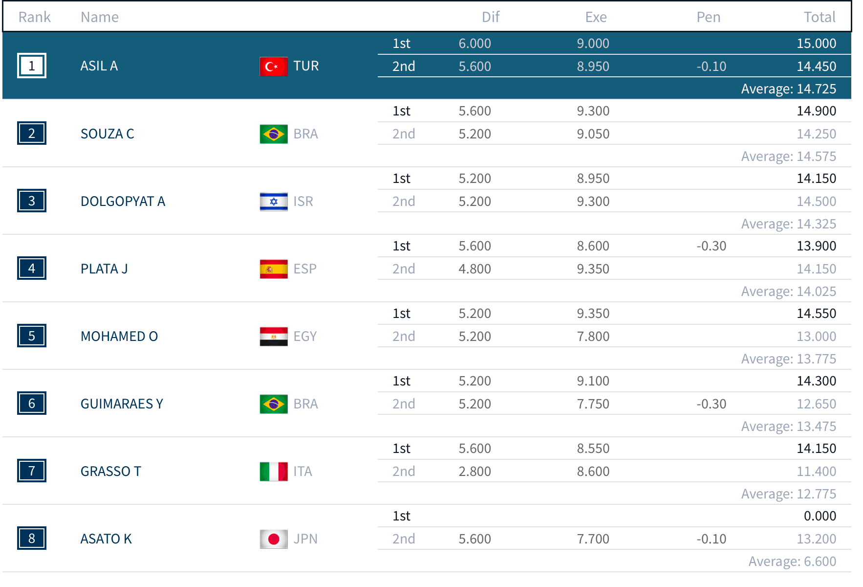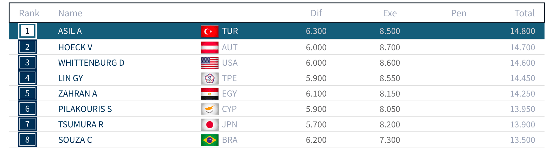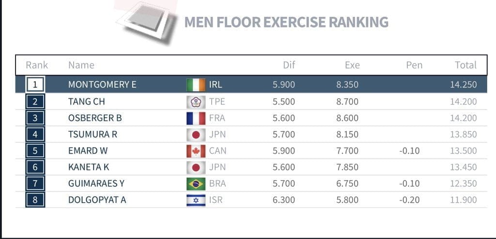 Dans les autres finales, Aline Friess termine 6eme aux barres, Mélanie De Jesus Dos Santos 6eme à la poutre, Mathias Philippe 5eme aux barres parallèles et Cameron-Lie Bernard 7eme aux barres parallèles.