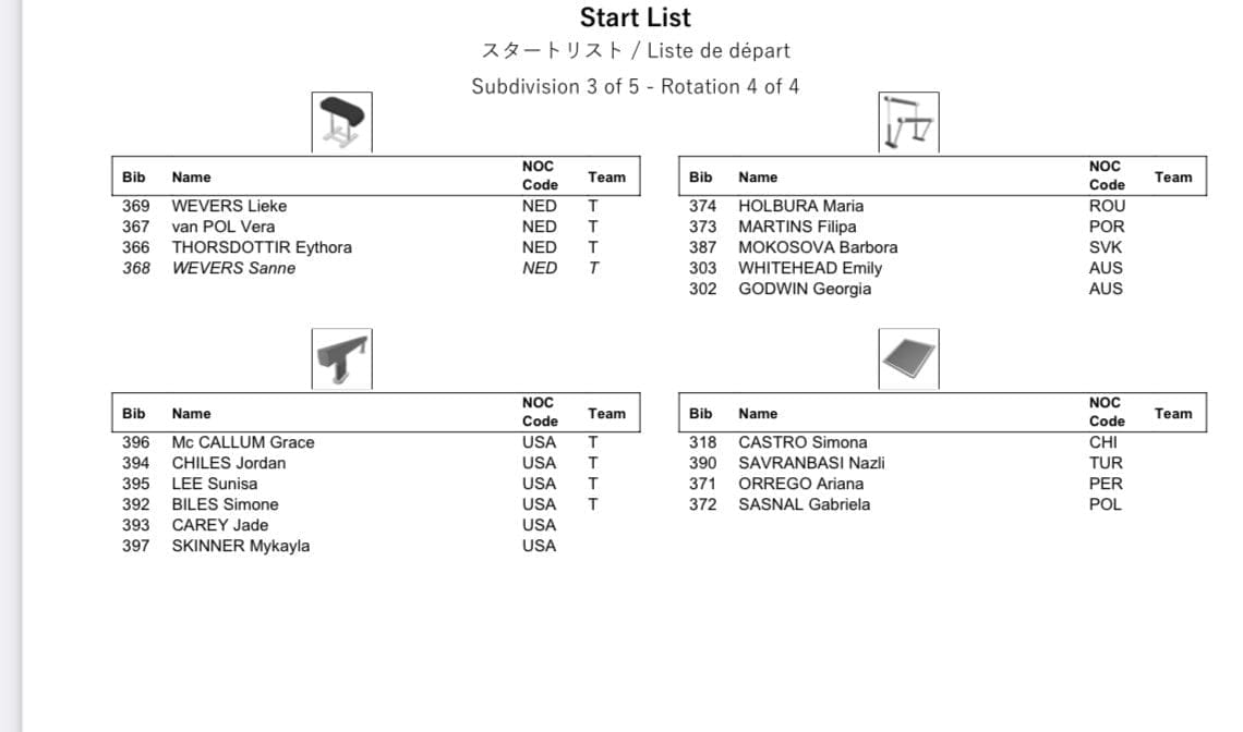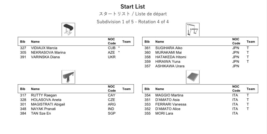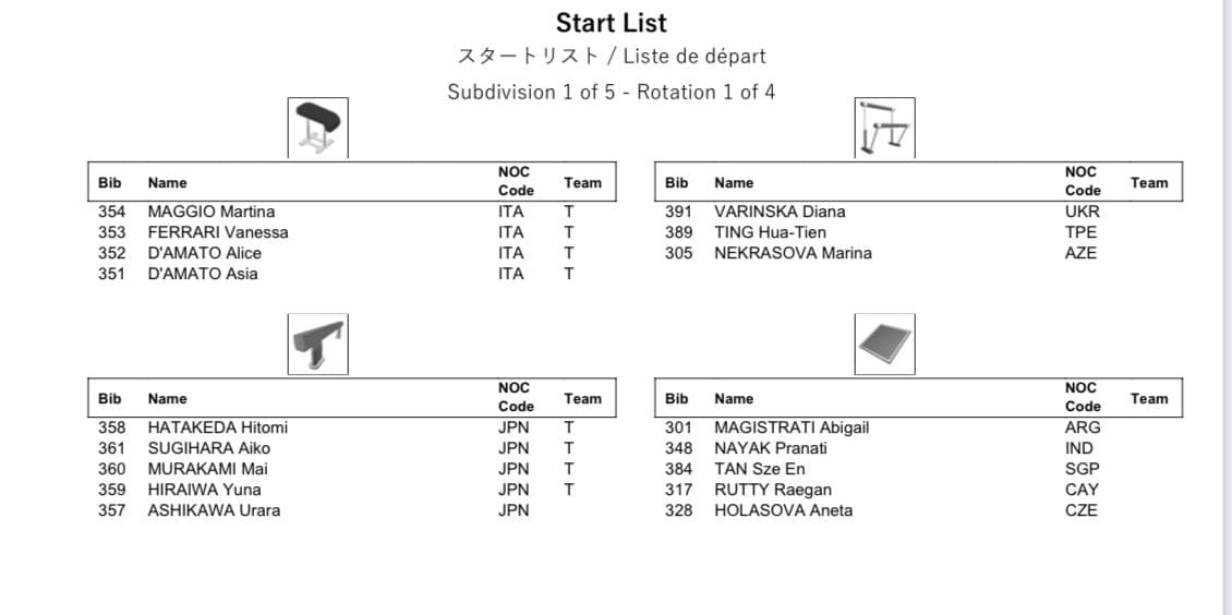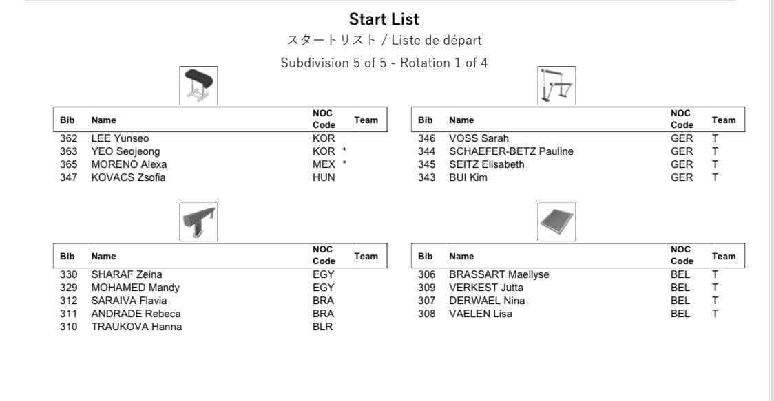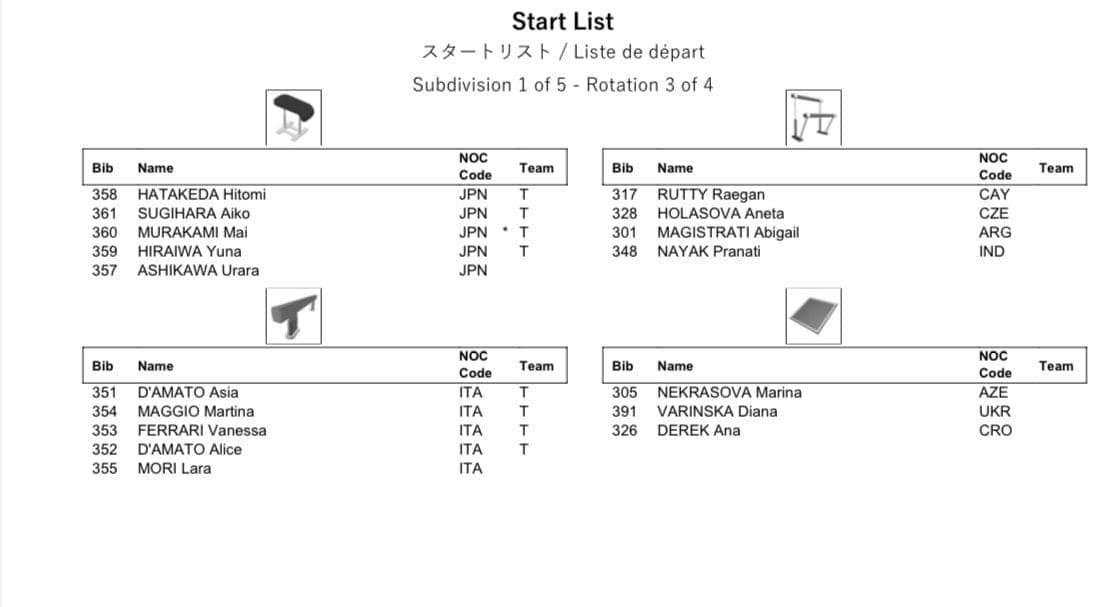 Parmi les 12 équipes, seules les 8 premières disputeront ensuite la finale du concours par équipes. Les équipes sont composées de 4 gyms. Les 4 gyms passent à l’agrès, 3 notes comptent dans le total points équipes, soit un format en 4/4/3.