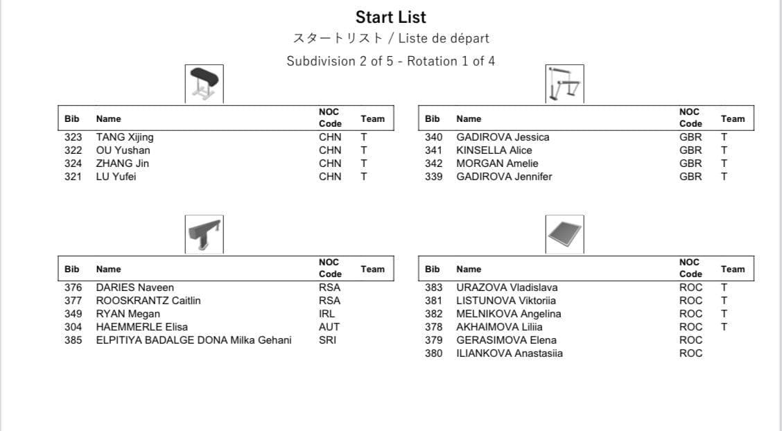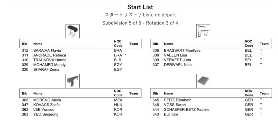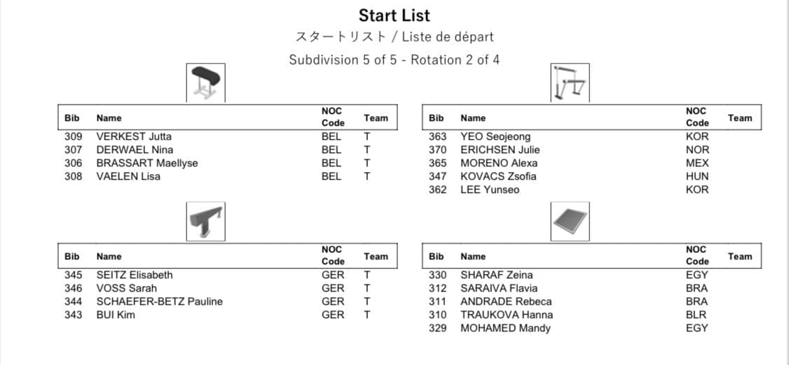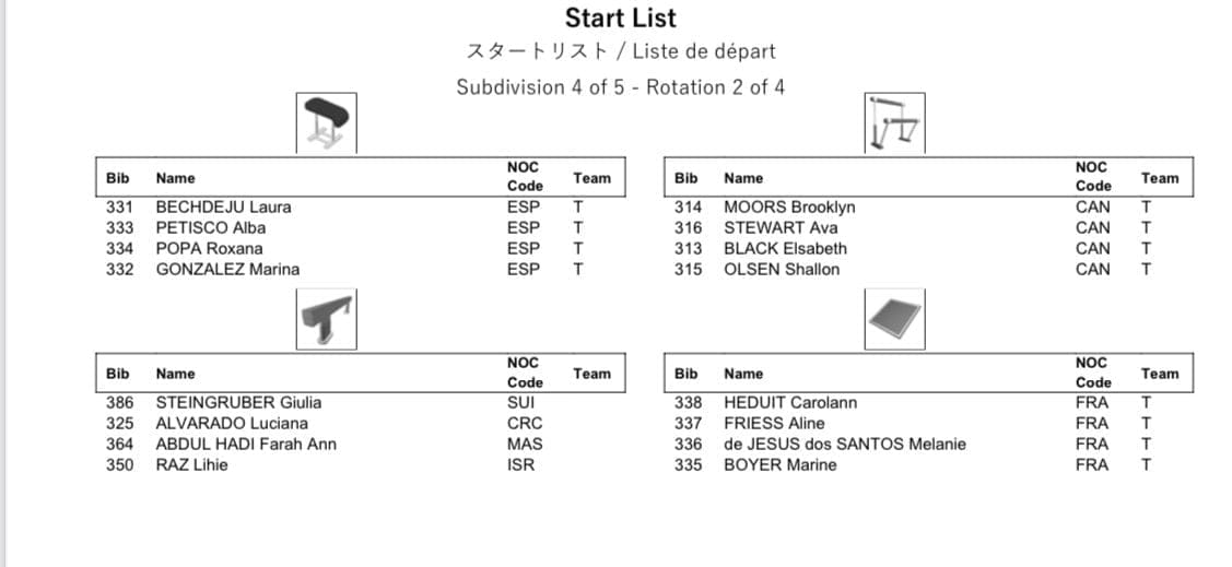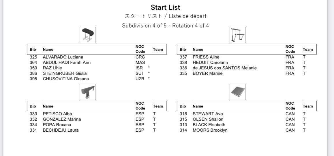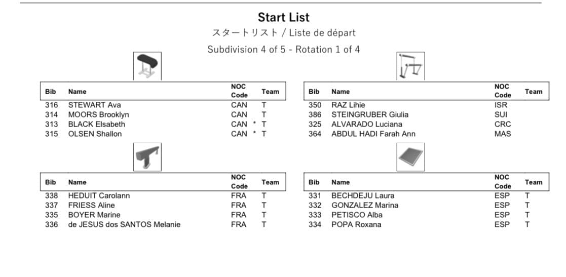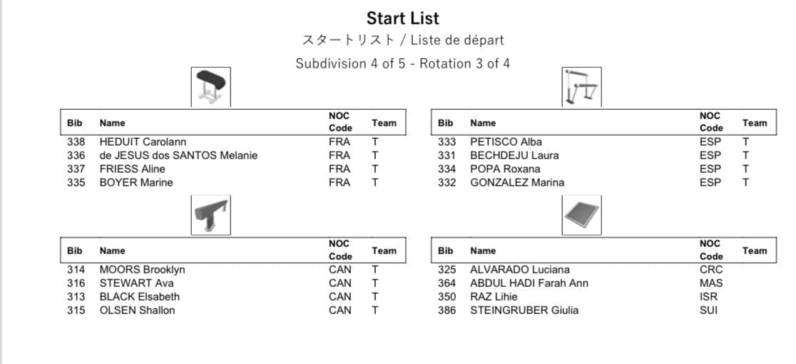Après les masculins ce samedi, c’est au tour des féminines de disputer leurs qualifications. L’équipe de France, composée de Mélanie De Jesus Dos Santos, Marine Boyer, Carolann Héduit et Aline Friess évolueront dans la 4eme subdivision (10h05, heure française). Elles débuteront leur compétition à la poutre et évolueront en même temps que les Espagnoles et les Canadiennes. Les Japonaises et les Italiennes ouvriront le bal et évolueront dans la première subdivision. Les Russes évolueront dans la deuxième subdivision, en même temps que les Chinoises et les Britanniques. On retrouvera les Américaines dans la troisième subdivision.