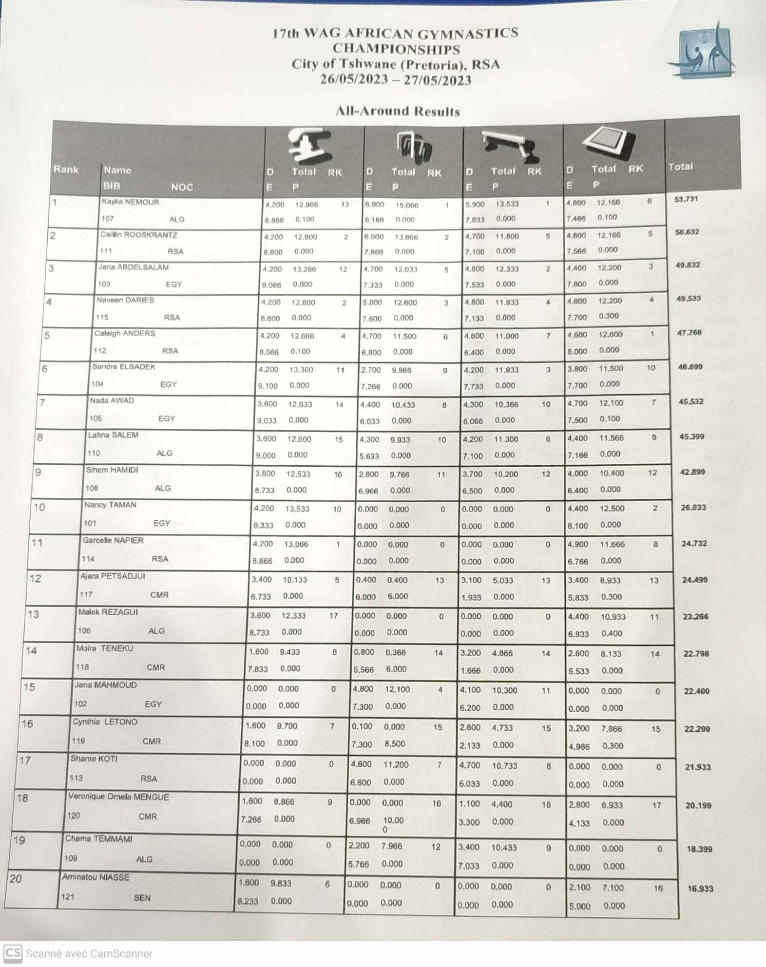 Les 4 gymnastes qualifiées pour les championnats du monde via le concours général sont Kaylia Nemour, Jana Abdelsalam, Sandra Elsadek et Lahna Salem. Pour rappel, quatre tickets étaient à prendre, hors gymnastes qualifiées en équipe donc hors gymnastes de l’Afrique du Sud avec un maximum de deux gymnastes par pays.