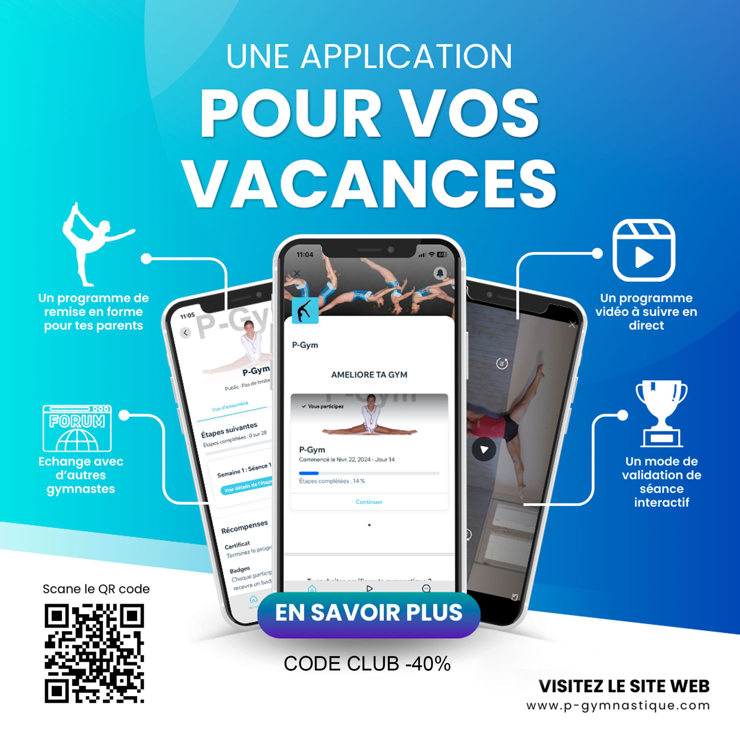 Alors à celles et ceux qui n’ont plus envie d’être dans le dur à la reprise, qui ont envie de maintenir leur niveau de forme physique et technique tout au long de l’été, de garder un pied dans la gymnastique et de profiter d’un programme de qualité pensé pour tous en bénéficiant d’un suivi personnalisé et de ressources adaptées à leurs besoins, aux clubs qui souhaitent proposer une solution d’entraînement novatrice à leurs adhérents tout en se développant économiquement, P-gym est la solution.