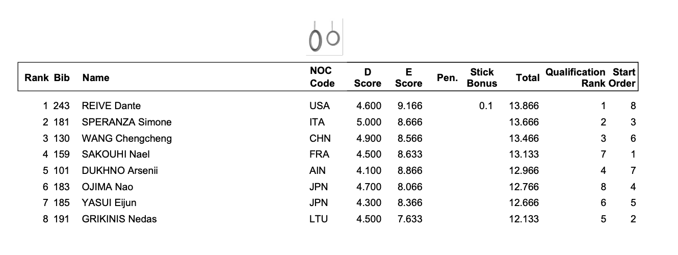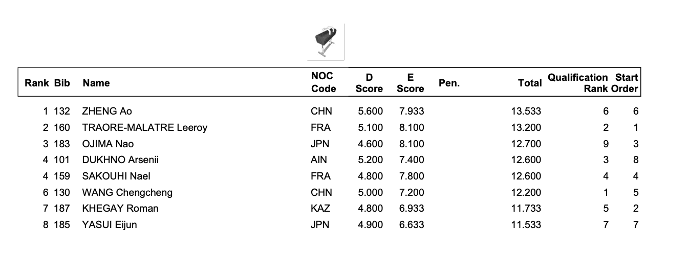 Egalement aligné sur cette finale arçons, Naël Sakouhi chute mais réalise un mouvement réussi sur le reste de son passage. Il termine 4ème, à 1 petit dixième de points de la médaille de bronze remportée par le japonais Nao Ojima, le deuxième finaliste avec Leeroy Traoré-Malatre qui n’a pas chuté.