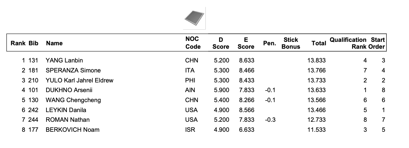 L’or revient au chinois Ao Zheng qui, malgré une chute, s’est hissé à la première place du classement grâce à une note de départ plus élevée et très peu de fautes d’exécution en dehors de la chute, lui permettant ainsi de faire la différence.