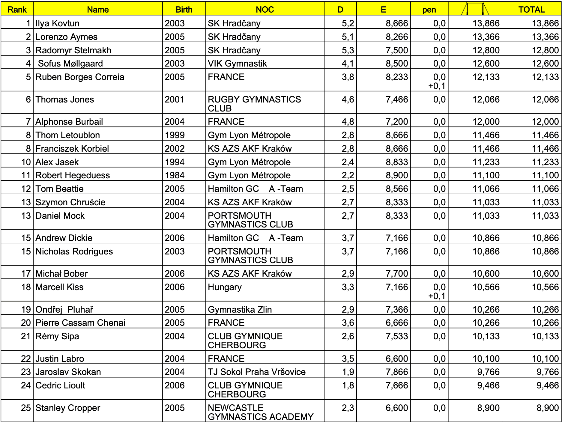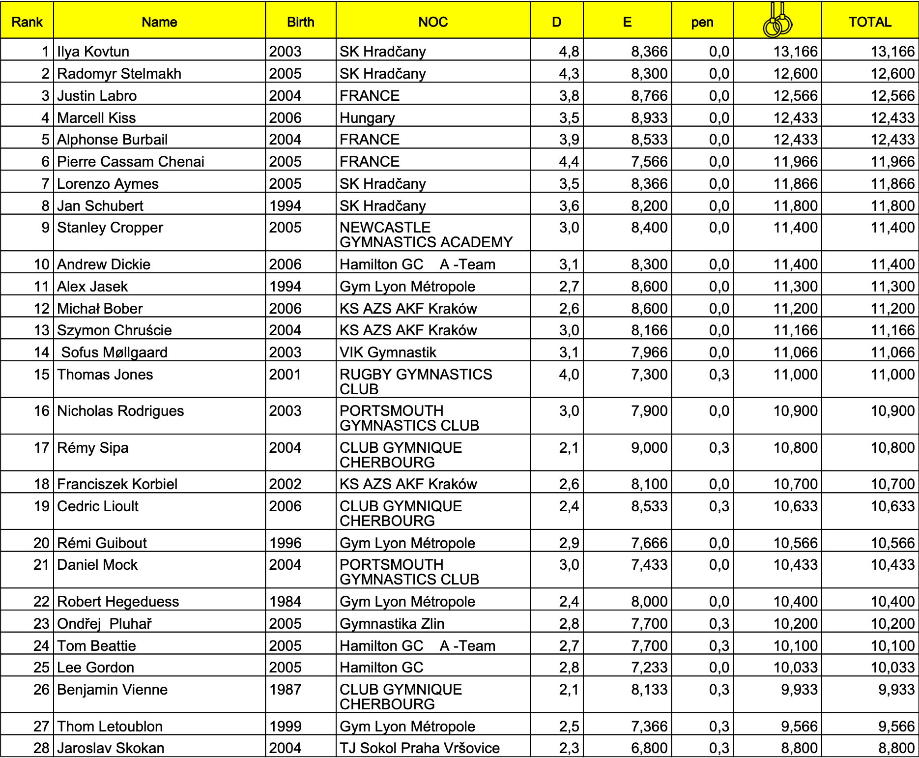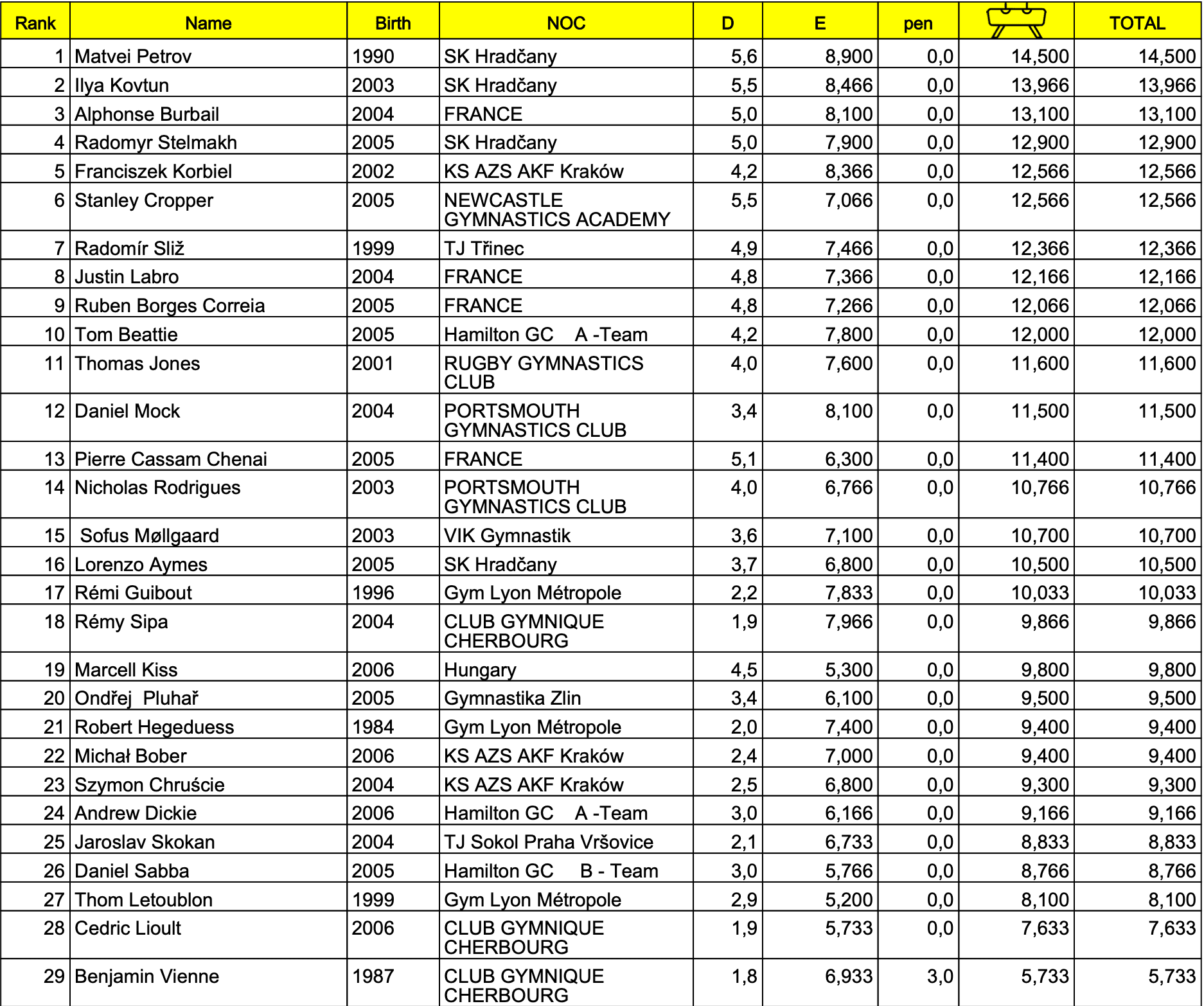 En individuel, les Français décrochent 4 places en finales avec Rubens Borges-Correia au sol (13,000), Alphonce Burbail aux arçons (13,100) et aux barres parallèles (13,366), et Justin Labro aux anneaux (12,566). Egalement présent sur la compétition sous les couleurs du club local organisateur SK Hradcany, Lorenzo Aymes se qualifie en finale fixe (13,366). Seuls les 4 premiers seniors à chaque agrès pouvaient se qualifier en finale.
