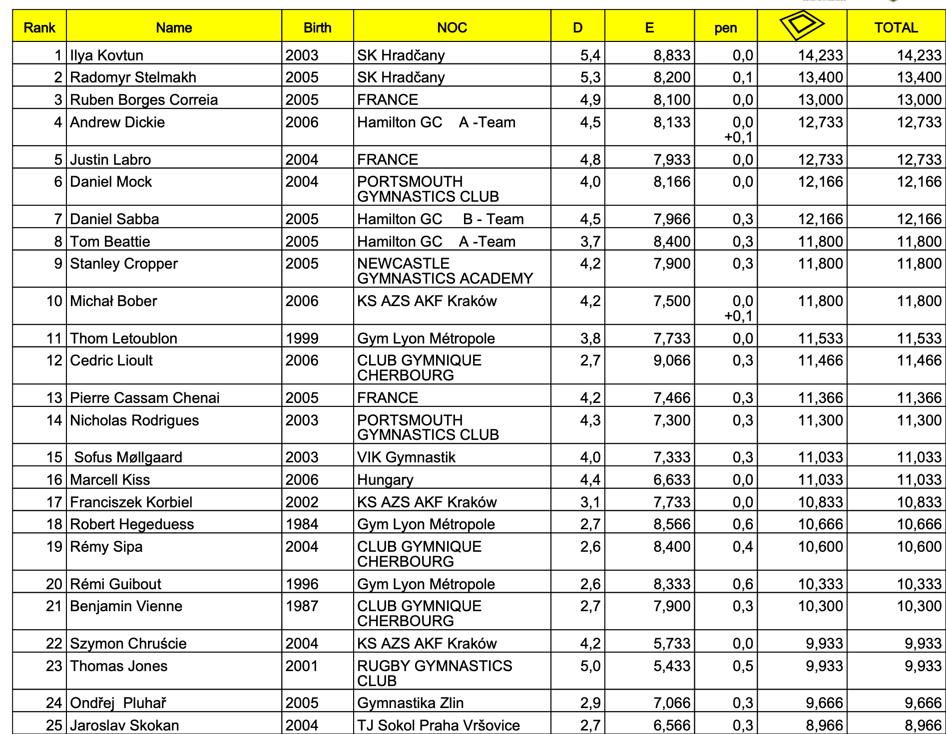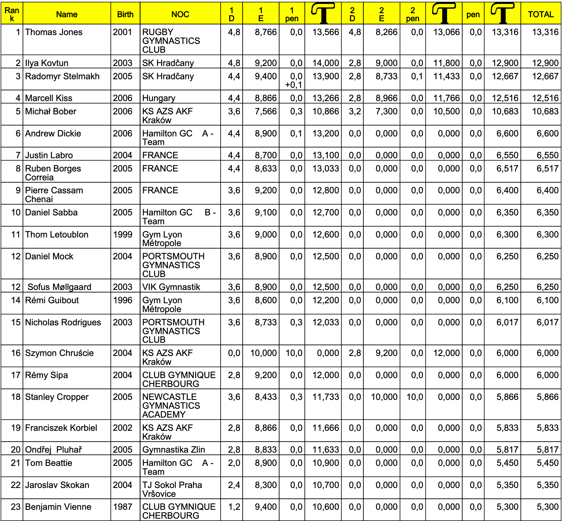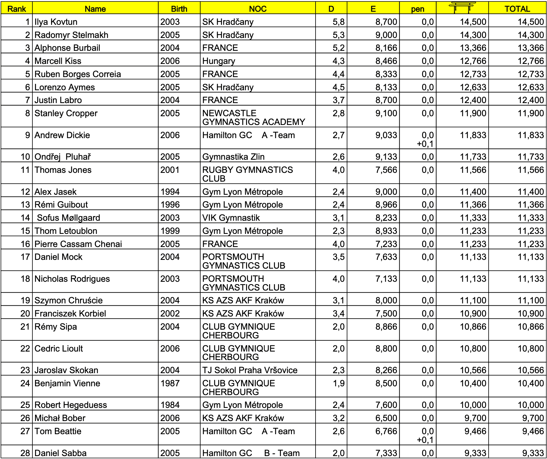 En individuel, les Français décrochent 4 places en finales avec Rubens Borges-Correia au sol (13,000), Alphonce Burbail aux arçons (13,100) et aux barres parallèles (13,366), et Justin Labro aux anneaux (12,566). Egalement présent sur la compétition sous les couleurs du club local organisateur SK Hradcany, Lorenzo Aymes se qualifie en finale fixe (13,366). Seuls les 4 premiers seniors à chaque agrès pouvaient se qualifier en finale.