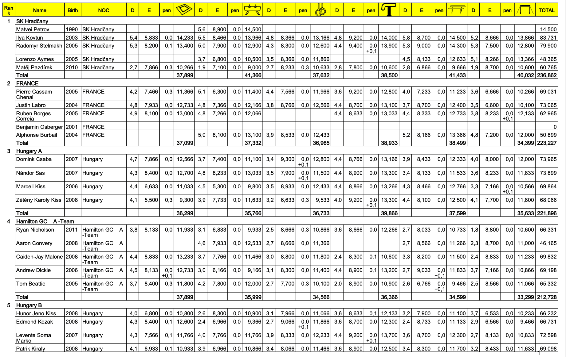 Pierre Cassam Chenaï, Alphonce Burbail, Benjamin Osberger, Rubens Borges-Correia et Justin Labro remportent l’argent à l’European Gymnastic League, compétition organisée à Prague ces 4 et 5 octobre, avec un total de 223,227 points. Justin Labro remporte le bronze au concours général.
