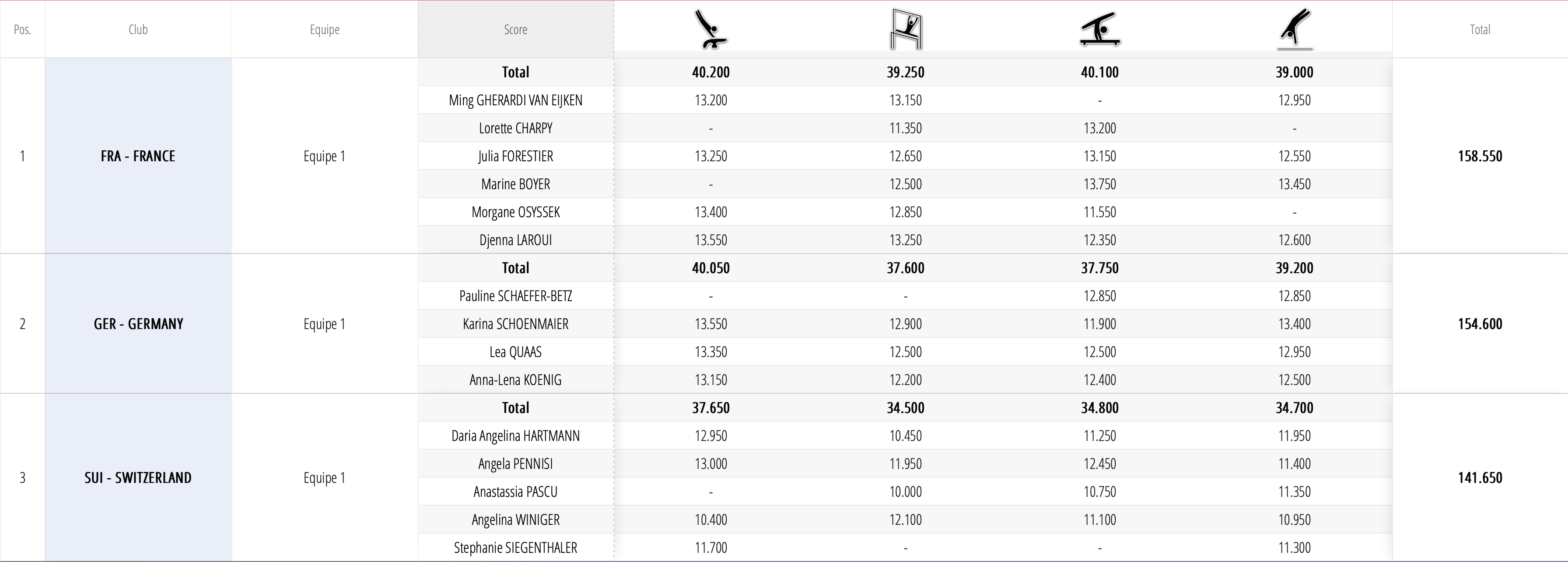 Au saut, rotation solide pour les Françaises qui proposent 4 sauts maîtrisés : tsukahara vrille pour Morgane Osyssek-Rimer (13,400), lune salto avant tendu demi-tour pour Djenna Laroui (13,550), tsuk vrille pour Ming Gherardi Van Eijken qui n’a pas présenté son gros saut en lune vrille et demi (13,200) et enfin yurchenko vrille pour Julia Forestier (13,250).
