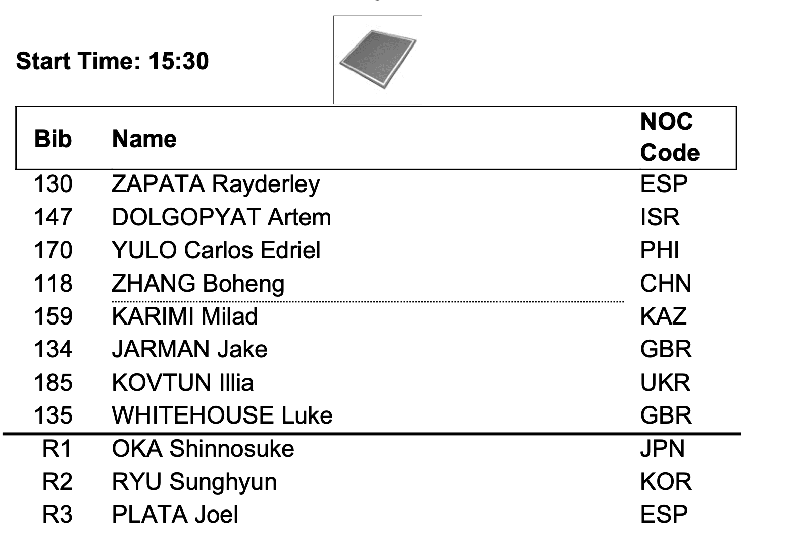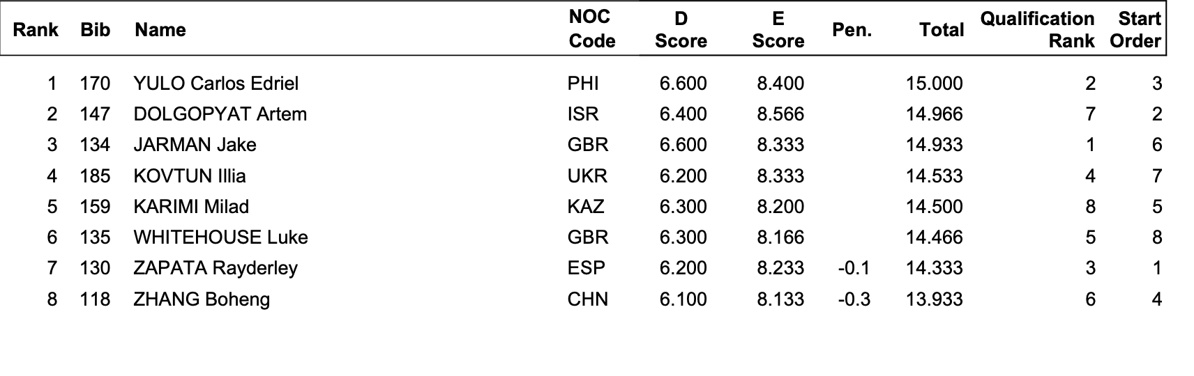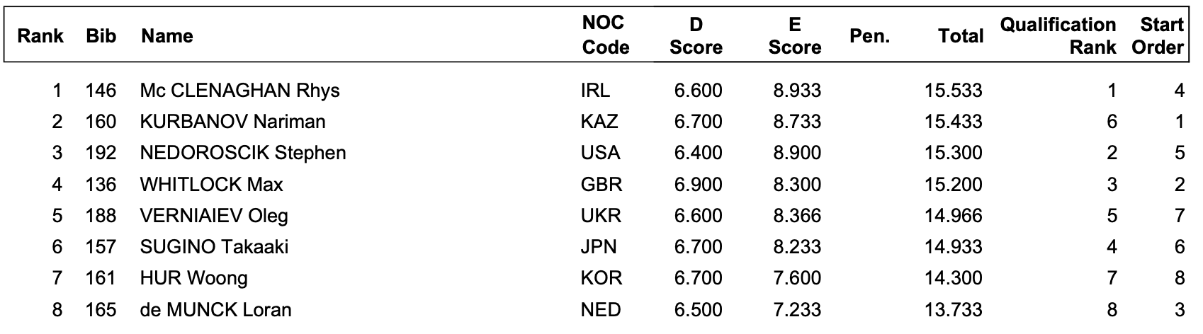 18h09 : Bon passage d’Oleg Verniaiev, une petite hésitation juste avant la sortie qui ne lui permet pas de perturber le trio de tête. Avec la note de 14,966, il se prend la cinquième place provisoire.