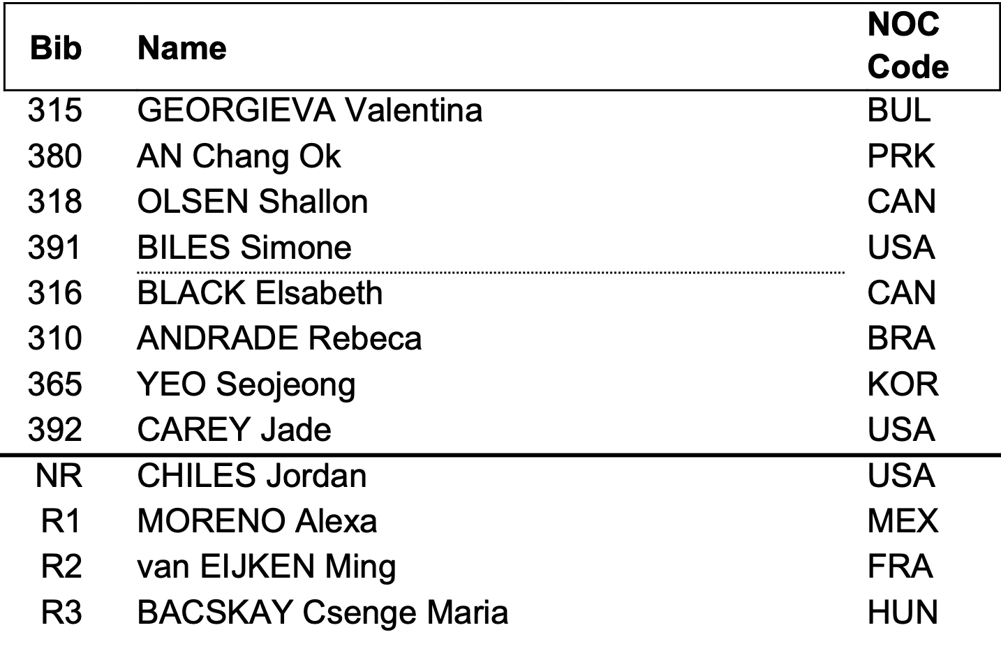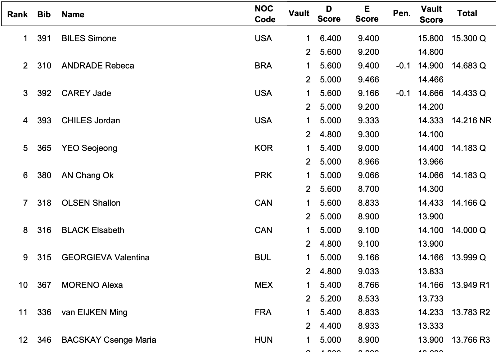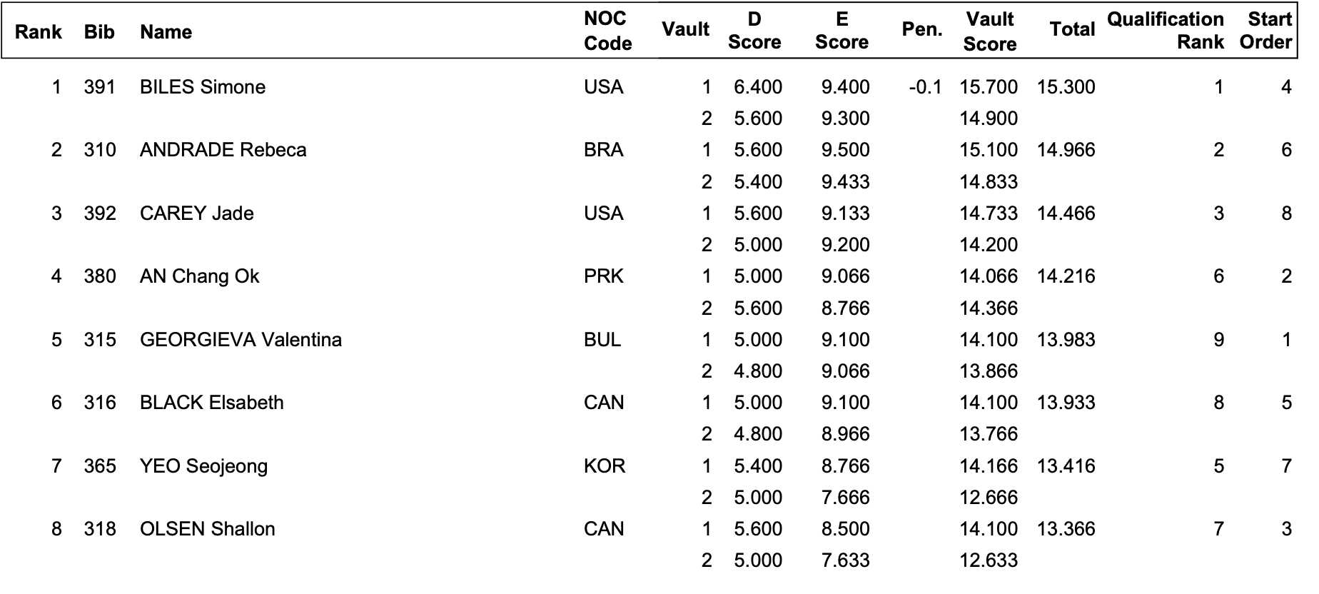 - Simone Biles 15,300 – 2. An Chang Ok 14,216 – 3. Valentina Georgieva 13,983