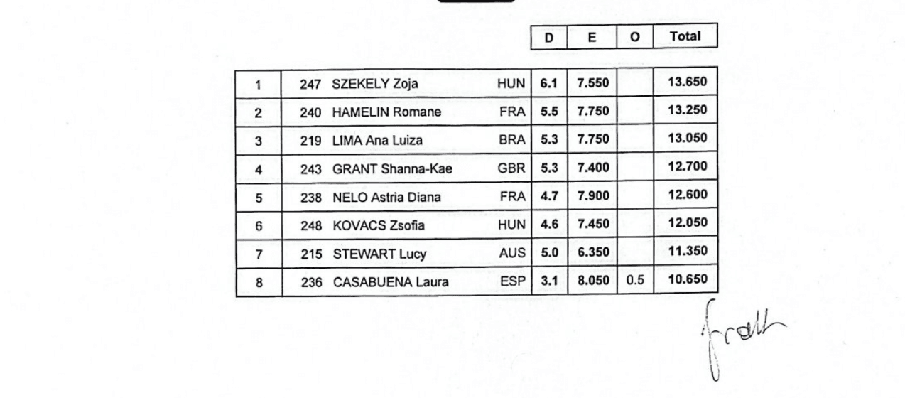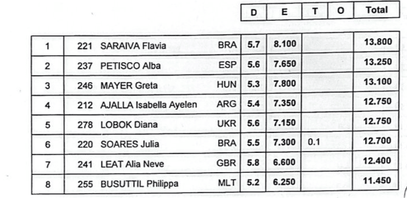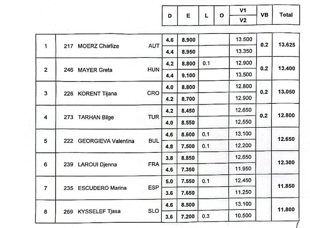 Également qualifiée en finale barres, Astria Nelo termine 5ème (12,600). Au saut, Djenna Laroui se classe 6ème.
