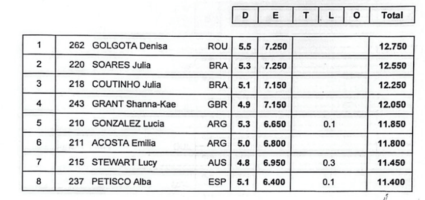 Au sol, l’or revient à la roumaine Denisa Golgotaa (12,750). L’argent et le bronze reviennent aux brésiliennes Julia Soares (12,550) et Julia Coutinho (12,250).