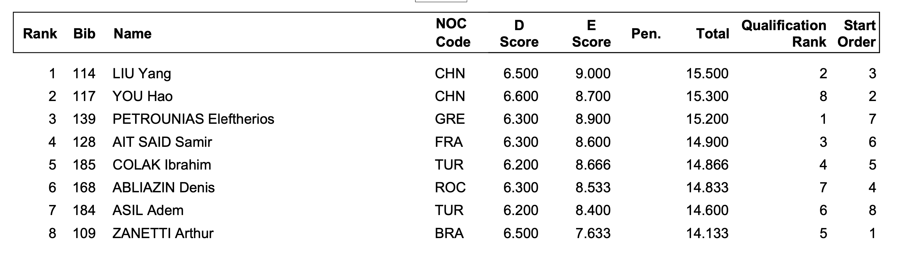 Samir Aït Saïd termine 4eme aux anneaux. L’or revient au chinois Yang Liu, époustouflant de solidité. Champion olympique en titre, Eleftherios Petrounias décroche le bronze. L’argent revient au chinois Hao You.