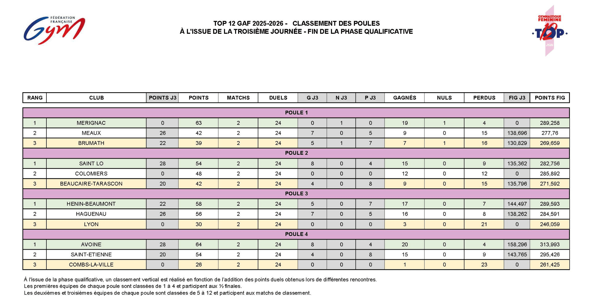 La première phase du Top 12 s’est terminée ce samedi 13 décembre. Mérignac, Avoine, Hénin-Beaumont et Saint-Lô se qualifient en demi-finale, une première pour Mérignac et Hénin-Beaumont. Brumath, Combs-La-Ville, Beaucaire et Lyon disputeront les matchs pour le maintien. Saint-Etienne, Meaux, Colomiers et Haguenau disputeront les matchs de classement.