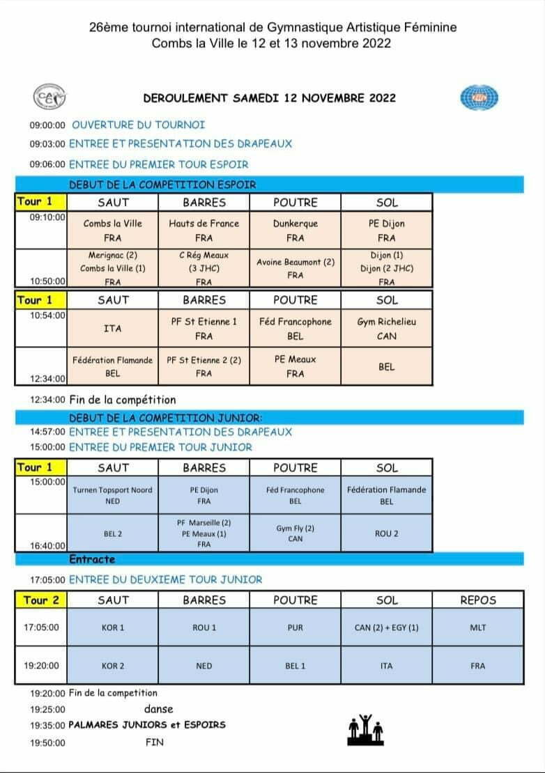 Le tournoi international de Combs-La-Ville, compétition réunissant les espoirs et les juniors féminines, se tient ces 11 et 12 novembre au gymnase Salvador Allende. Voici les gymnastes annoncées.