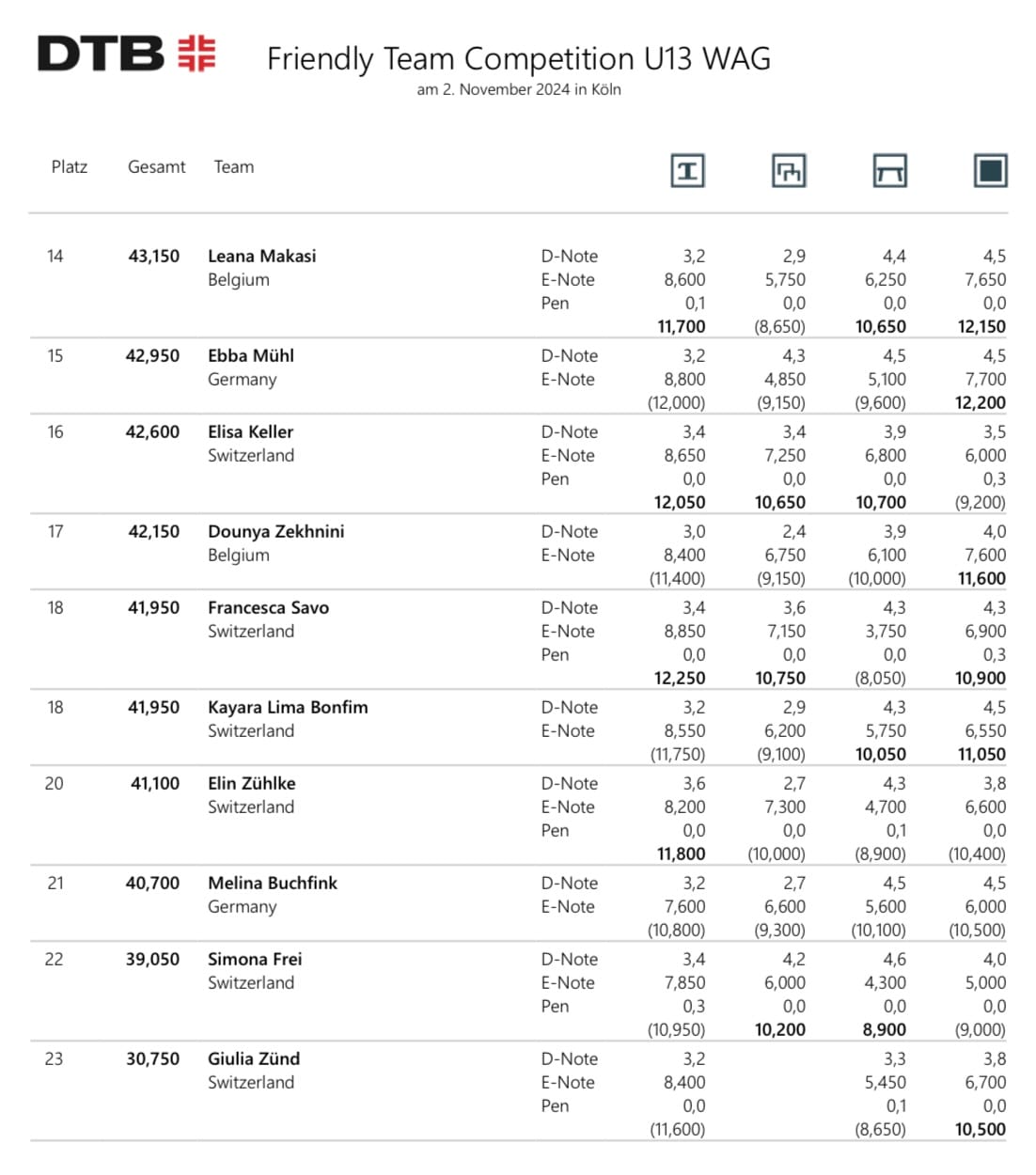En équipe, Louane Plisson, Caly Chayani, Chloé Jurado, Maia Ferreira Da Silva Elizagoyen, Lilou Marliac et Taina Virlogeux remportent l’or avec un total de 148,350 points, terminant avec plus de 8 points d’avance sur l’Allemagne, deuxième avec 140,100. La Belgique remporte le bronze et la Suisse termine quatrième.