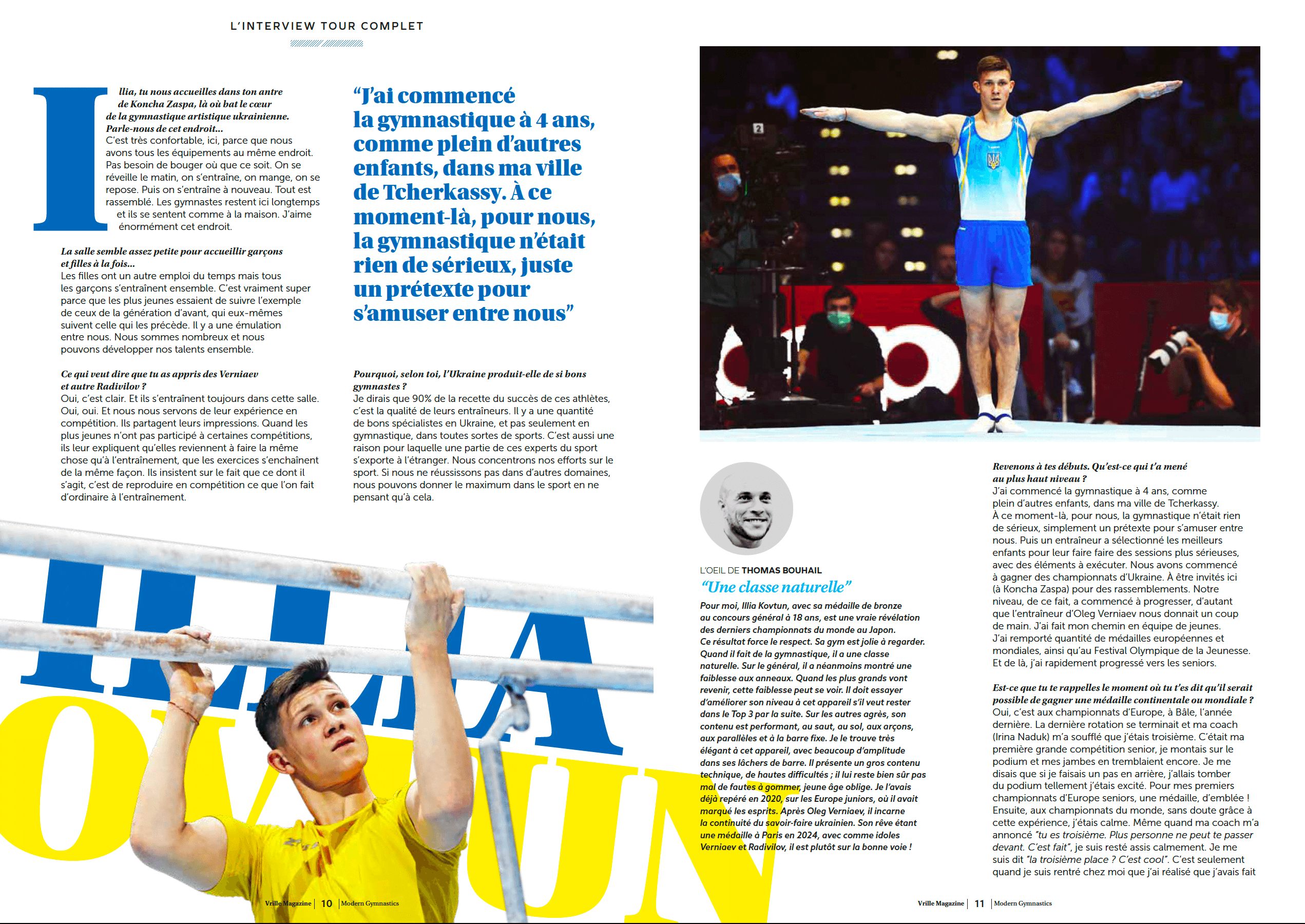 À l’intérieur, on y parle de gymnastique artistique, rythmique, de trampoline, de tumbling, de gymnastique acrobatique, d’aérobic, de teamgym, de parkour. Une ode à la gymnastique qui donne la parole aux champions, au grand public, mais également à tous les acteurs de la gymnastique comme les juges, les entraîneurs, les kinés, etc, aussi bien en France qu’à l’étranger.